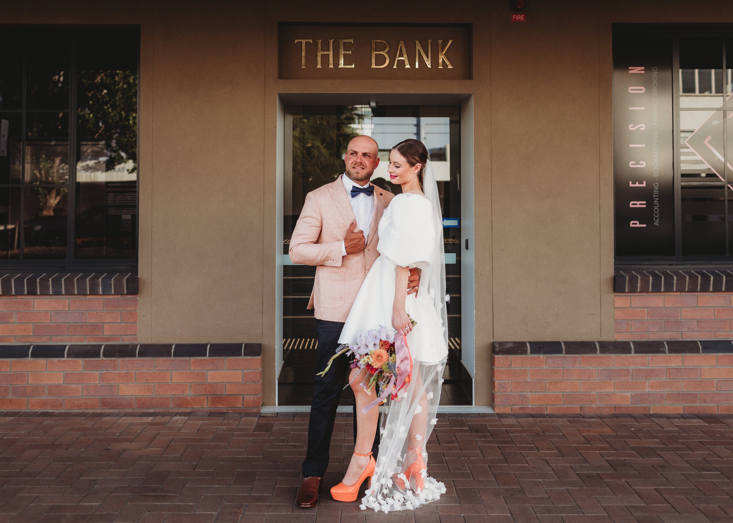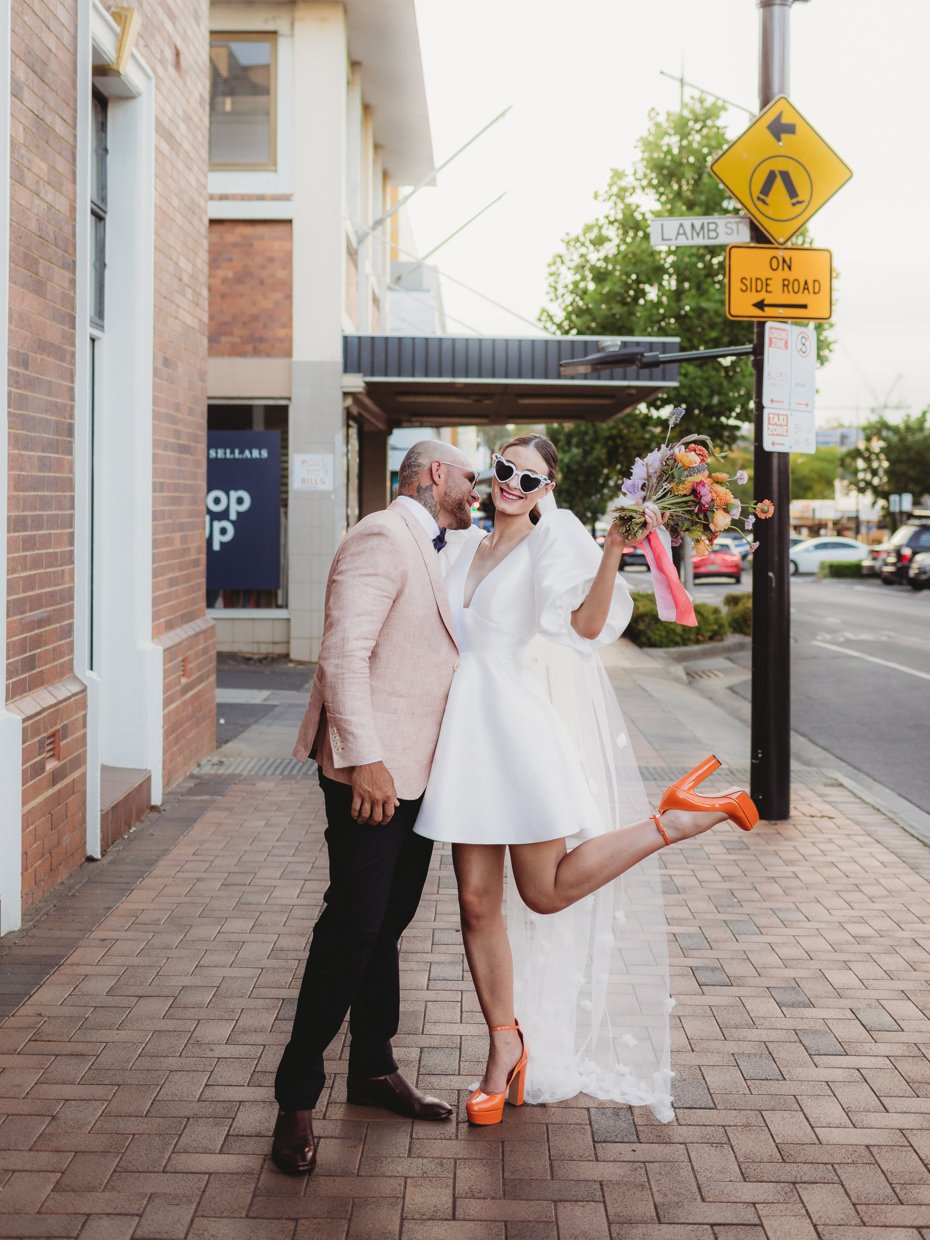 In the heart of Toowoomba city, love took center stage in our recent styled shoot, ‘Inner City Elopement,’ a celebration of modern romance and flirty vibes. The star of the show was the stunning ‘Belle‘ dress by Melbourne-based designer Oui the Label, setting the tone for a day filled with fun, colour, and the magic of urban love. Paired with our fun petal veil and vibrant orange heels we crafted a bridal look that was fashion-forard, fun and brought out the charm of the day.