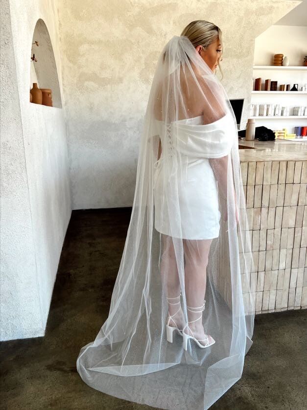 Bling up your bridal look with our glitter veil. Silver glitter throughout gives it a glistening look.