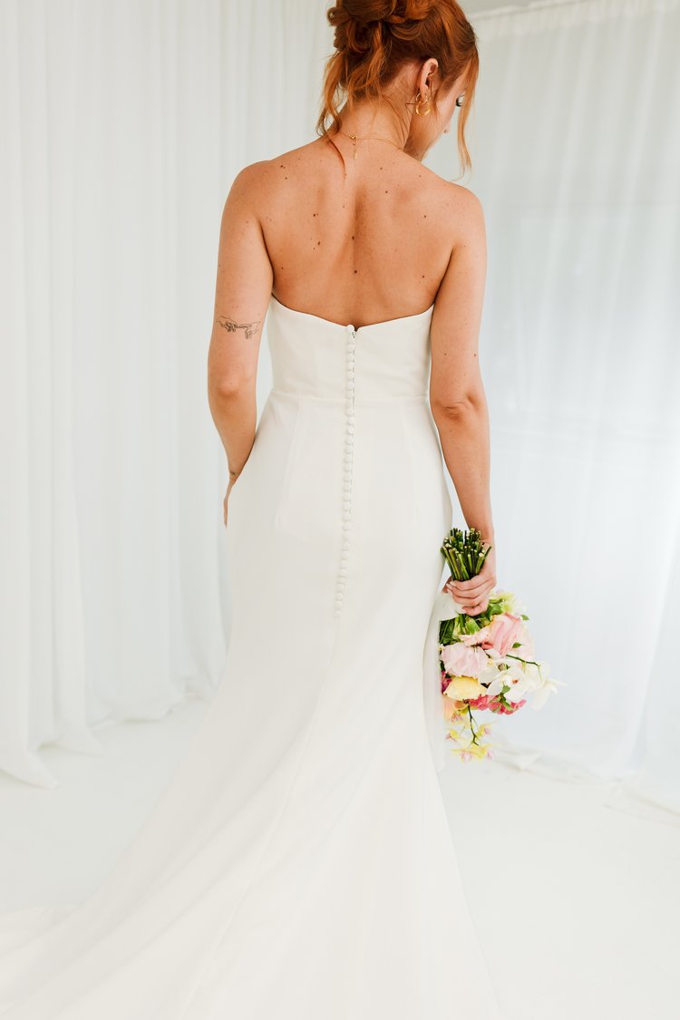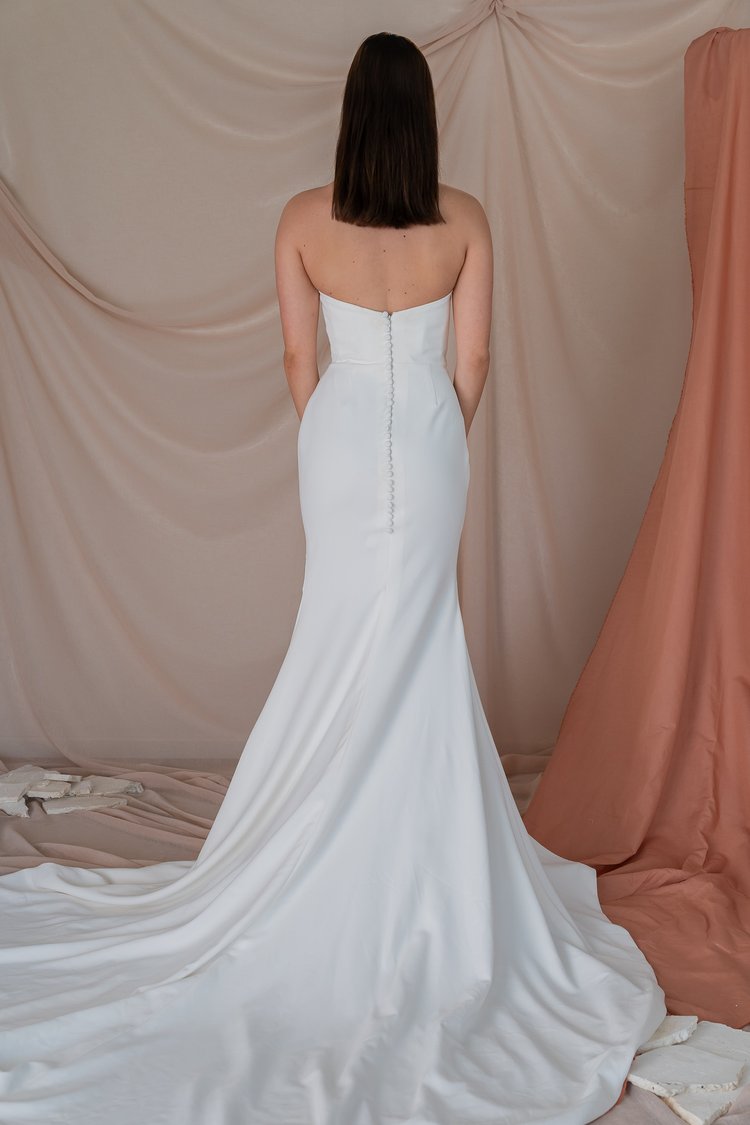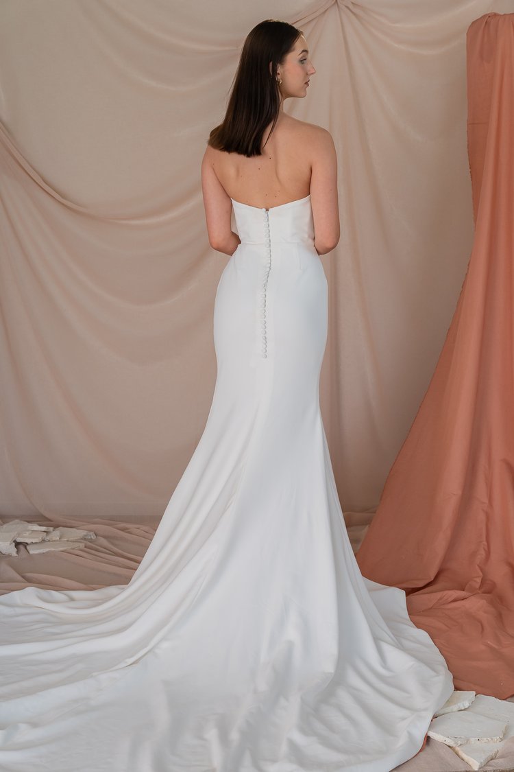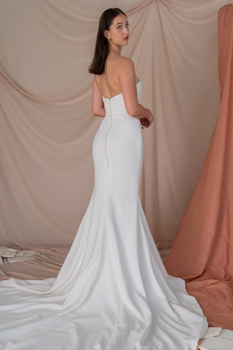 This strapless fitted gown is perfect for the bride wanting a chic and clean aesthetic. Made with a high quality crepe fabric, it’s structed to fit and drape beautifully with an open leg split and buttons the entire way down the train. Perfect to pair with any of our sleeves, veils or drop earrings.