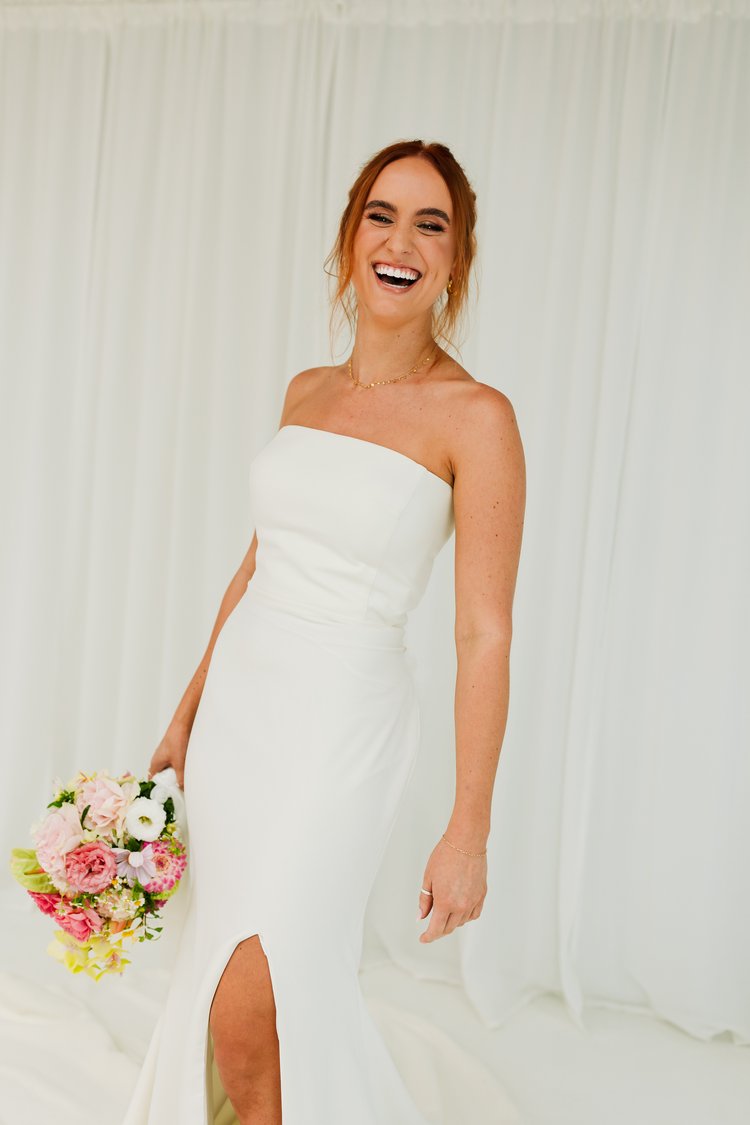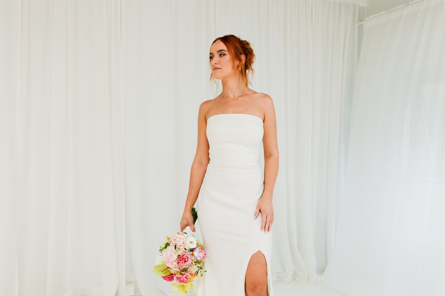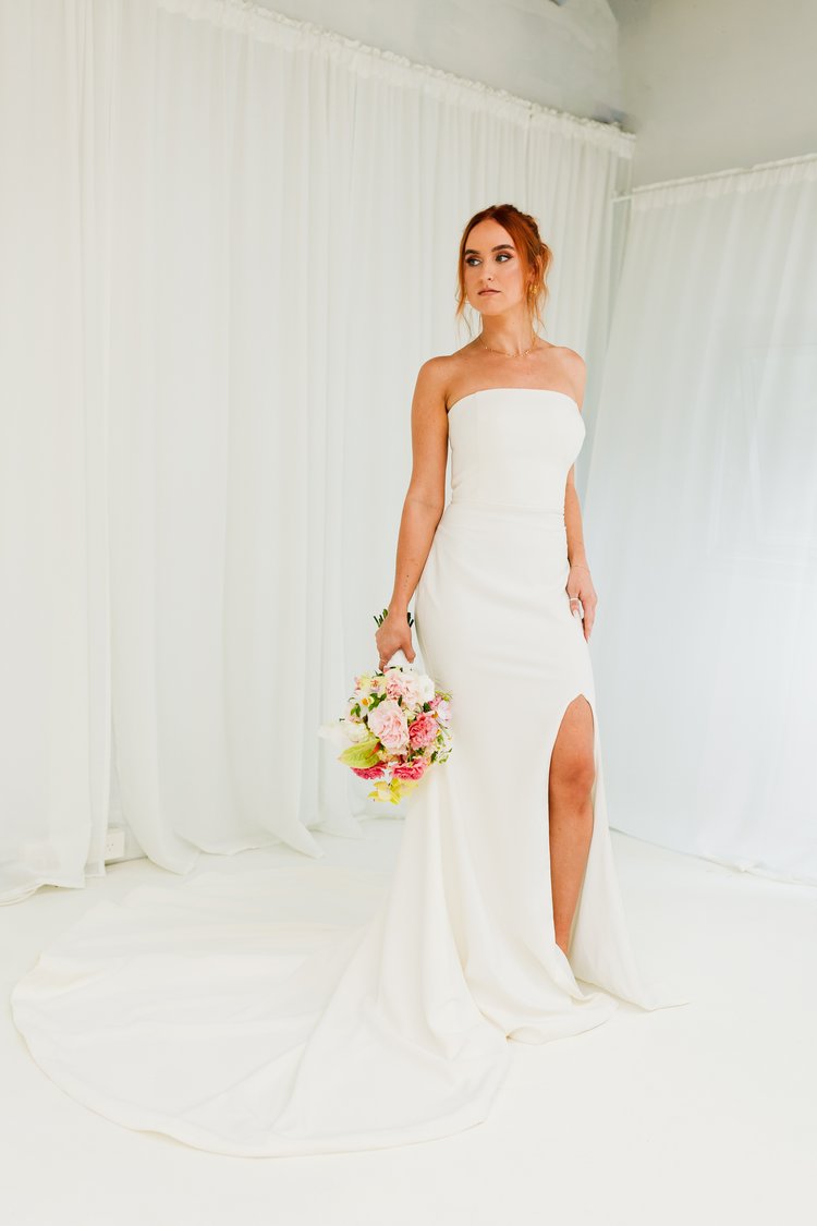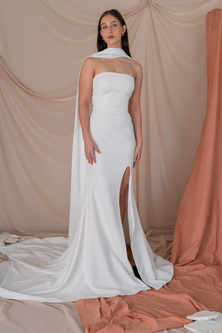 This strapless fitted gown is perfect for the bride wanting a chic and clean aesthetic. Made with a high quality crepe fabric, it’s structed to fit and drape beautifully with an open leg split and buttons the entire way down the train. Perfect to pair with any of our sleeves, veils or drop earrings.