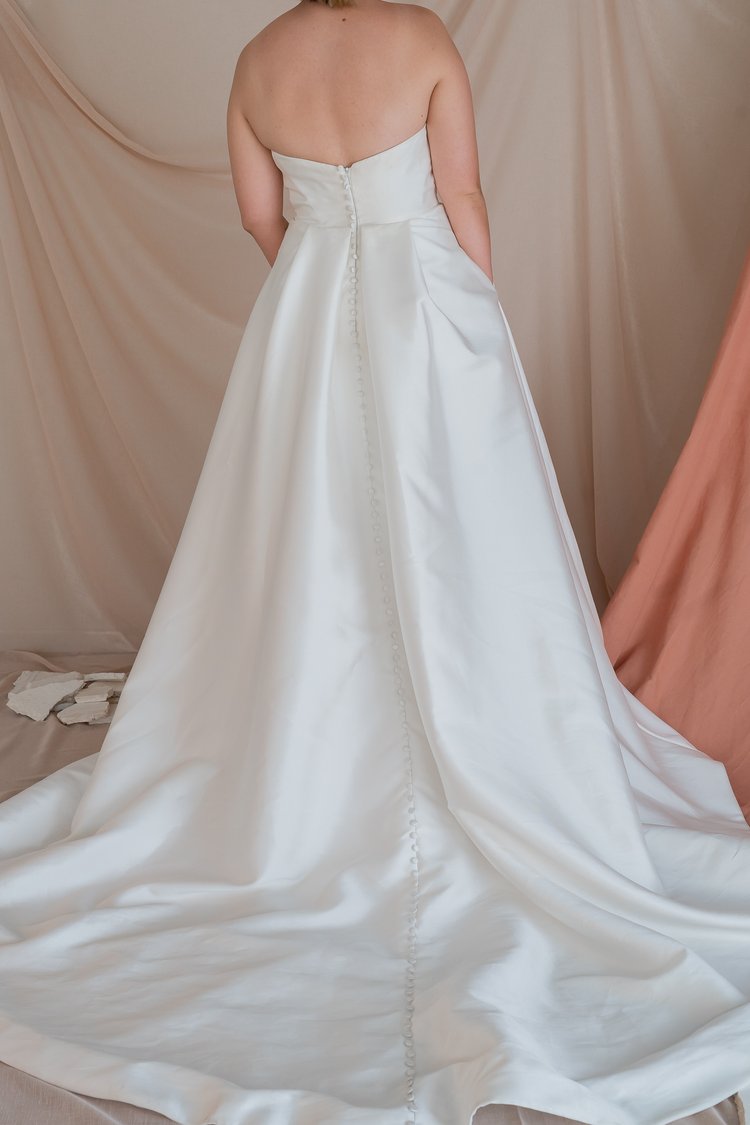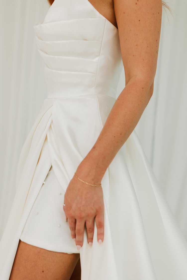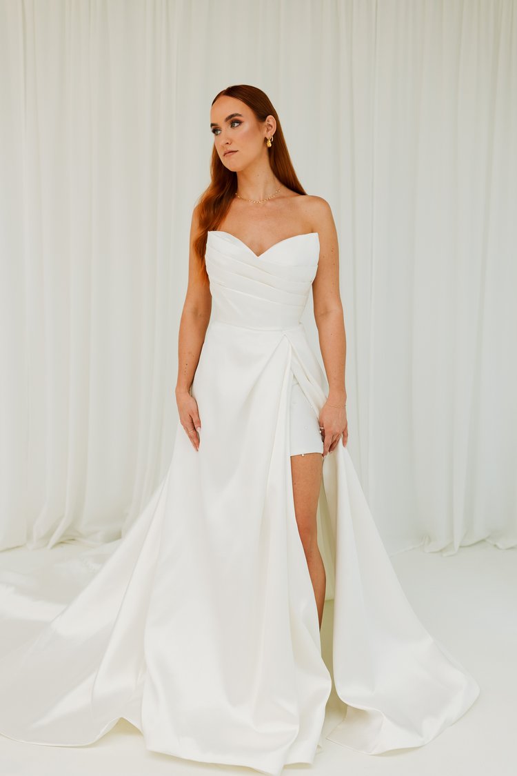 This stunning strapless gown could be the perfect one for you! With a stunning lightweight mikado fabric, rouching and a sexy split this dress screams modern day elegance. Perfect to pair with sleeves for the ultimate cool bride look.