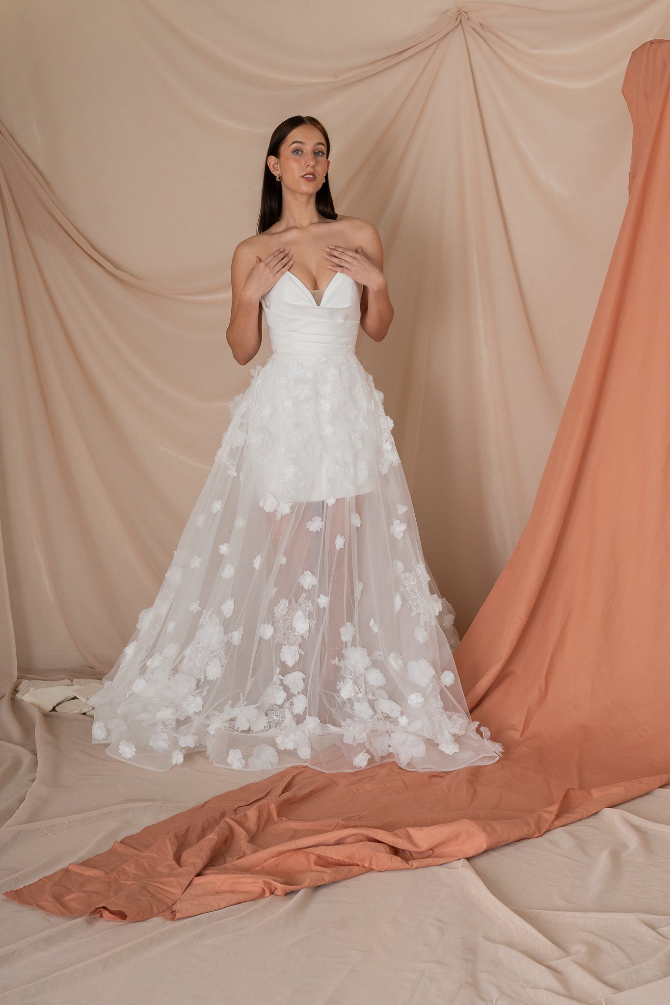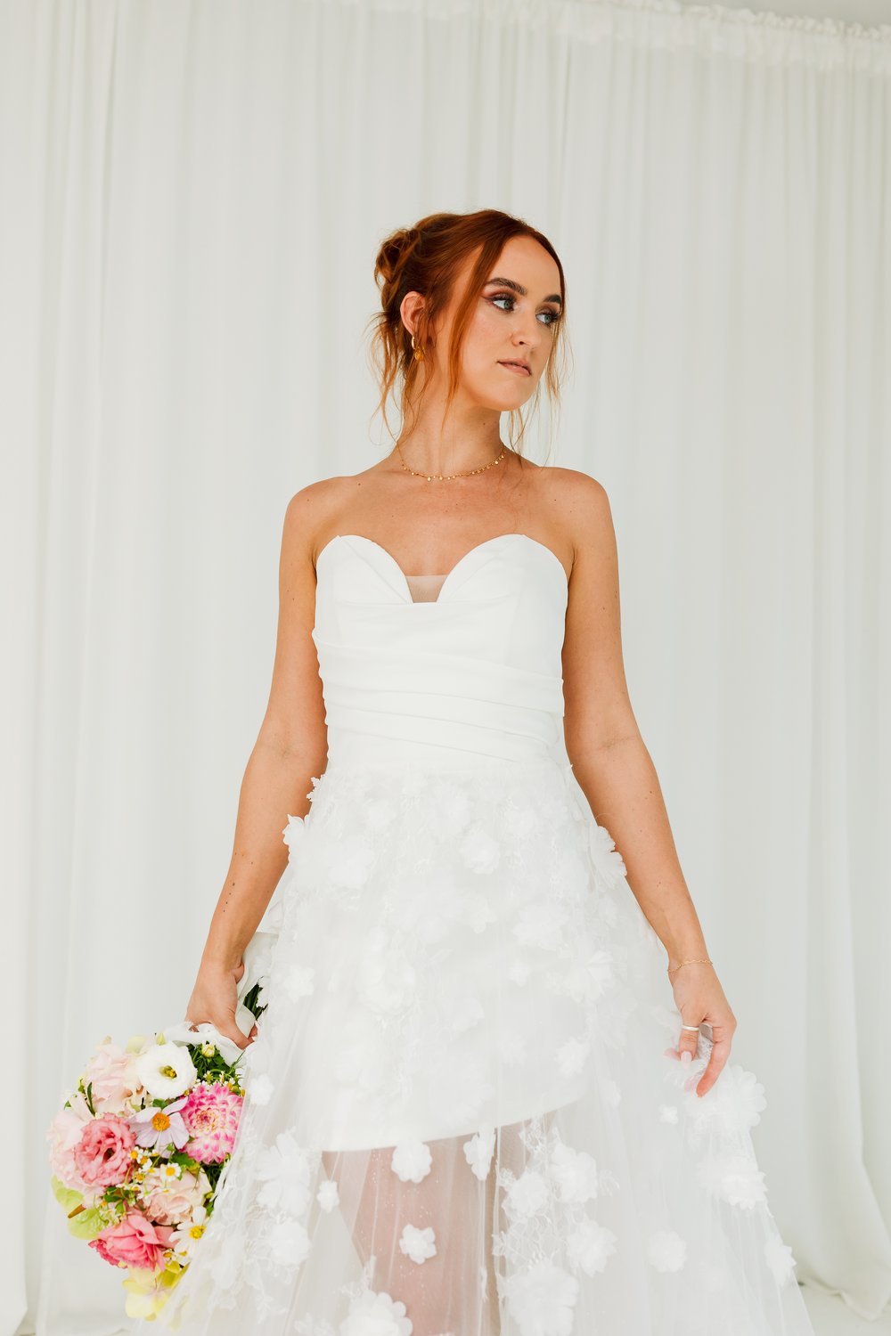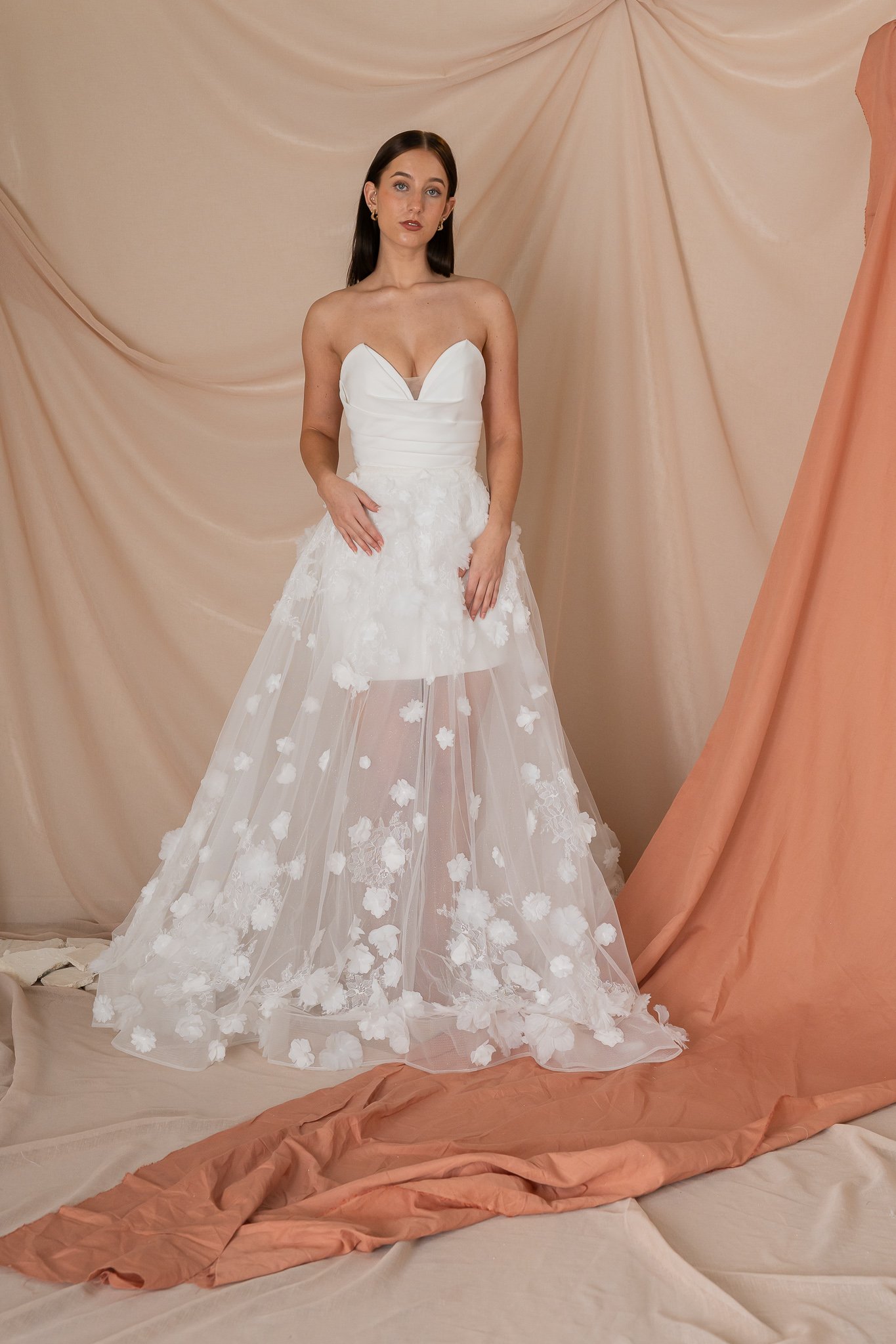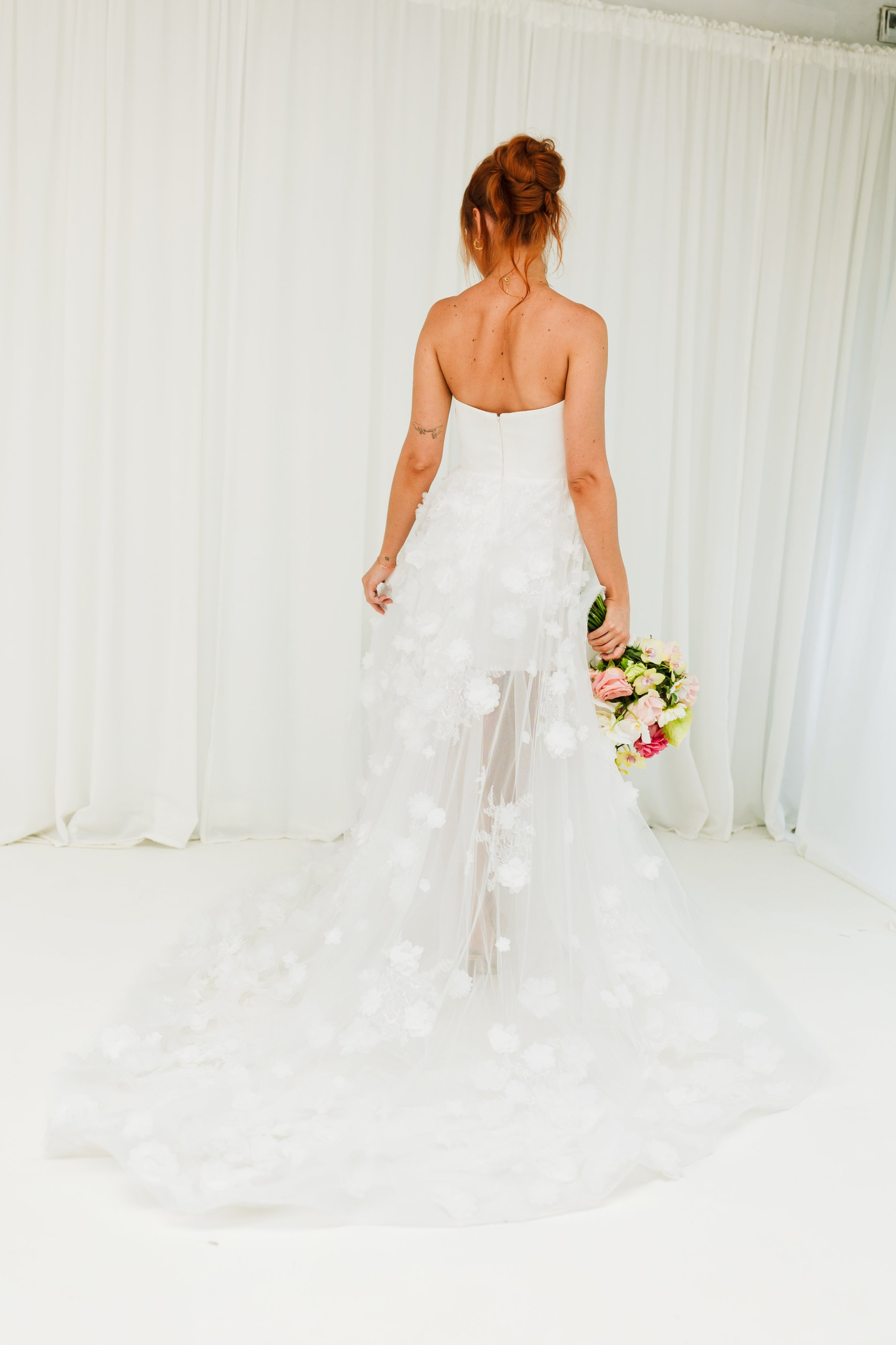 This breathtaking gown is a bit of a fan favourite! We’ve done her as a high-low, with a detachable skirt or used fabric as a mini. She’s totally customisable – or keep her as is! Isn’t she a cutie? The stunning glitter tulle, topped with chantilily lace and floral applique makes the skirt not only super dreamy but also carefully thought out with an eye for bridal fashion chasing the wow moment. The underlay is able to be fully lined for a more traditional look.