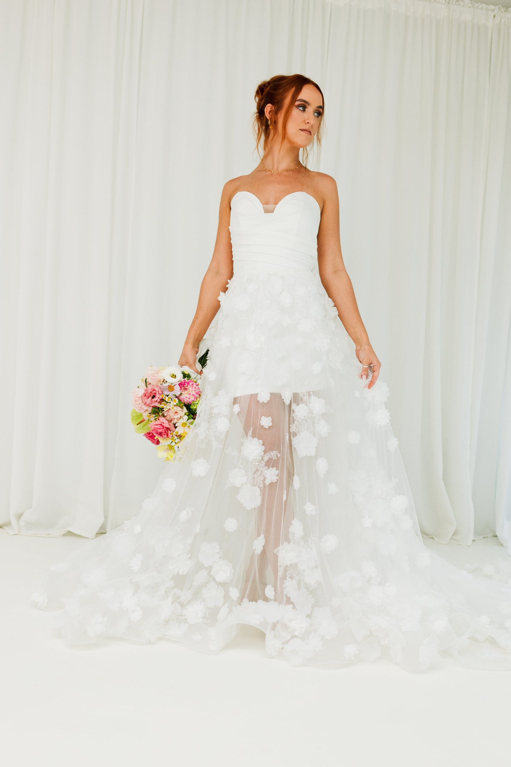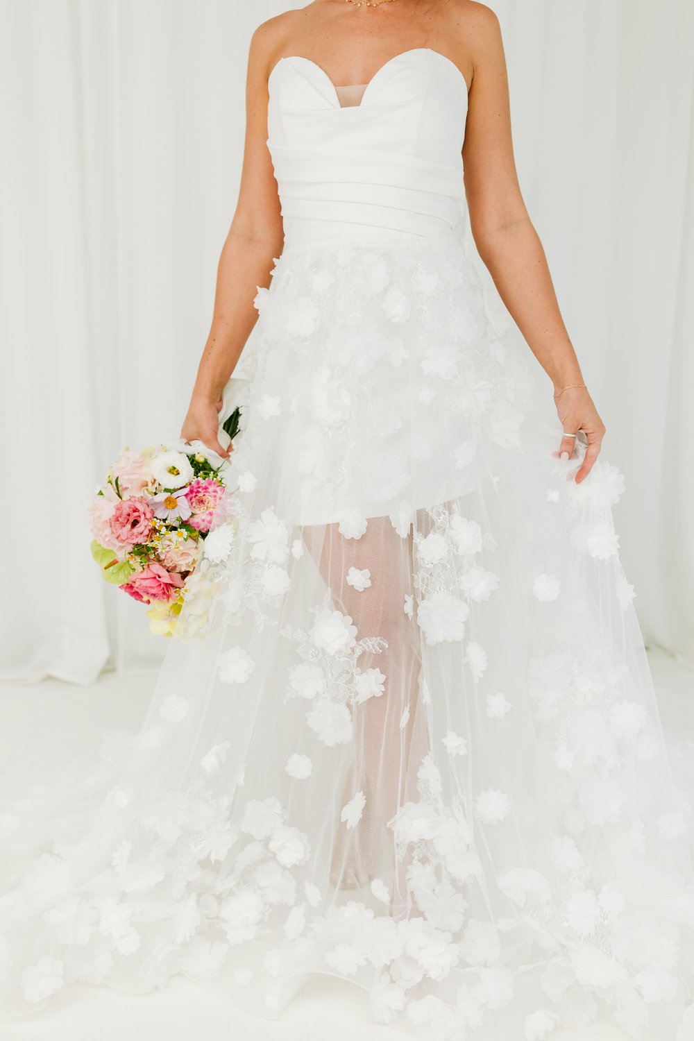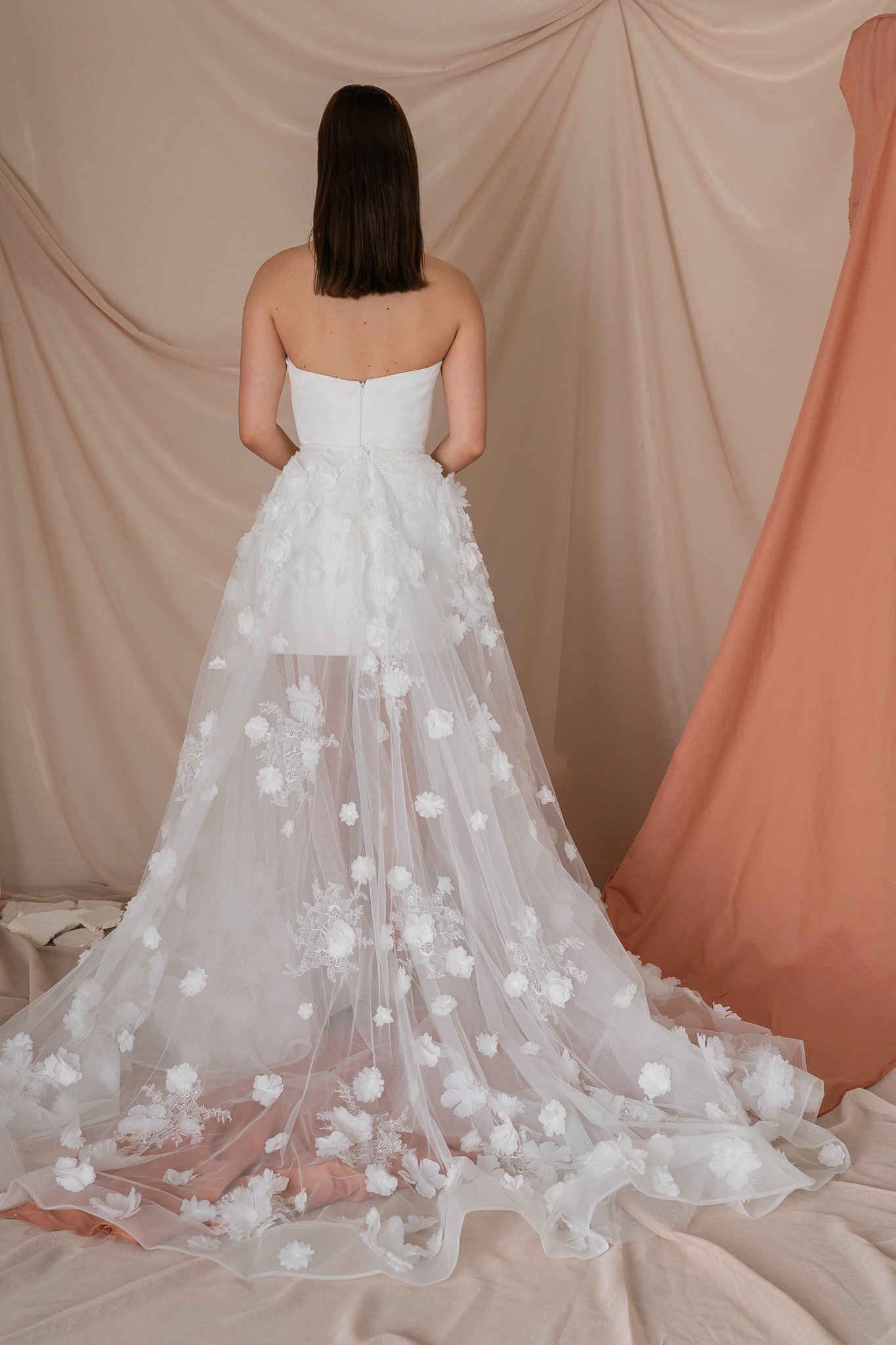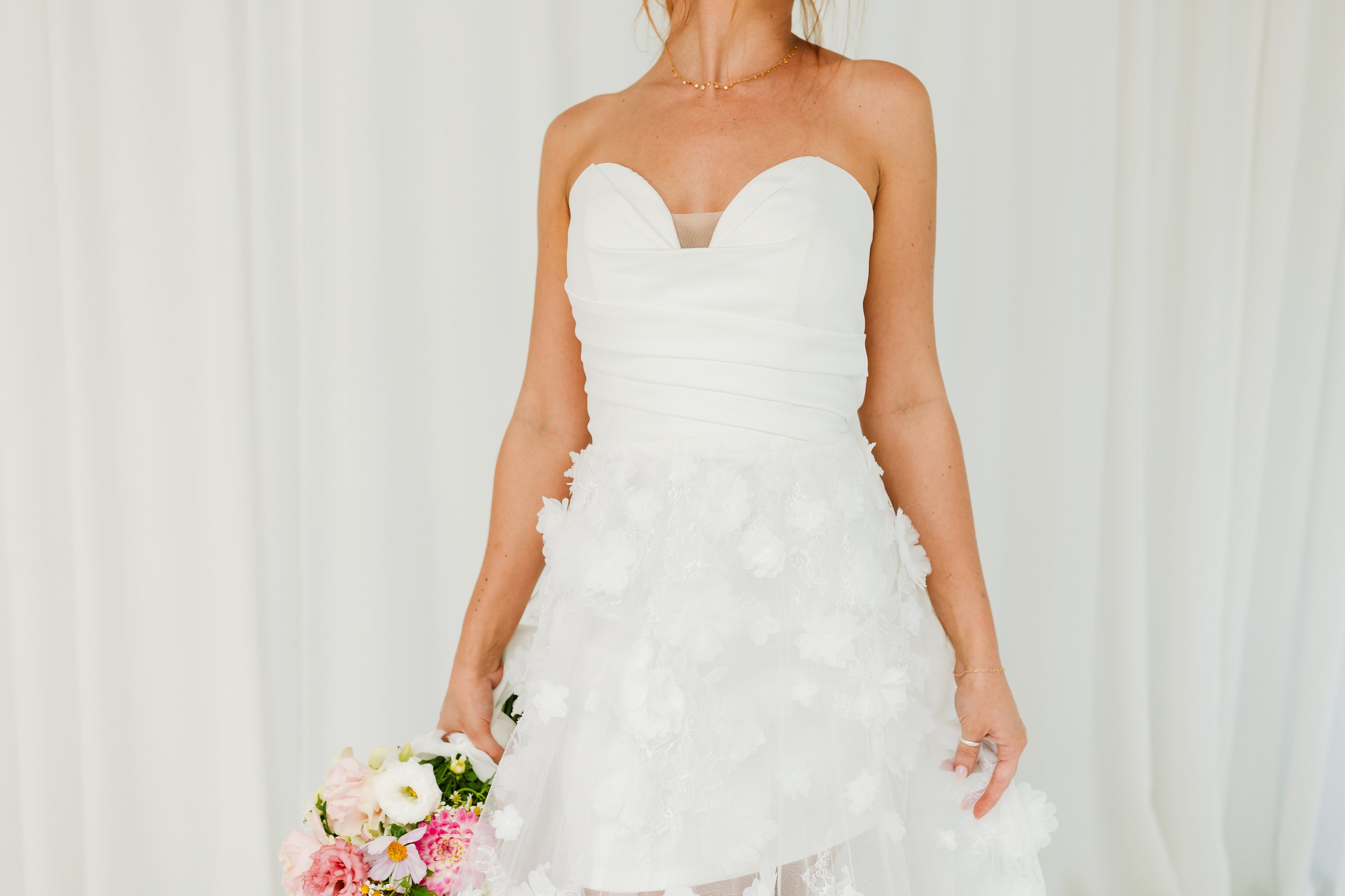 This breathtaking gown is a bit of a fan favourite! We’ve done her as a high-low, with a detachable skirt or used fabric as a mini. She’s totally customisable – or keep her as is! Isn’t she a cutie? The stunning glitter tulle, topped with chantilily lace and floral applique makes the skirt not only super dreamy but also carefully thought out with an eye for bridal fashion chasing the wow moment. The underlay is able to be fully lined for a more traditional look.
