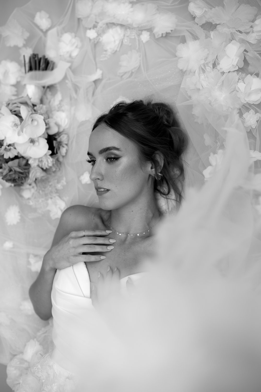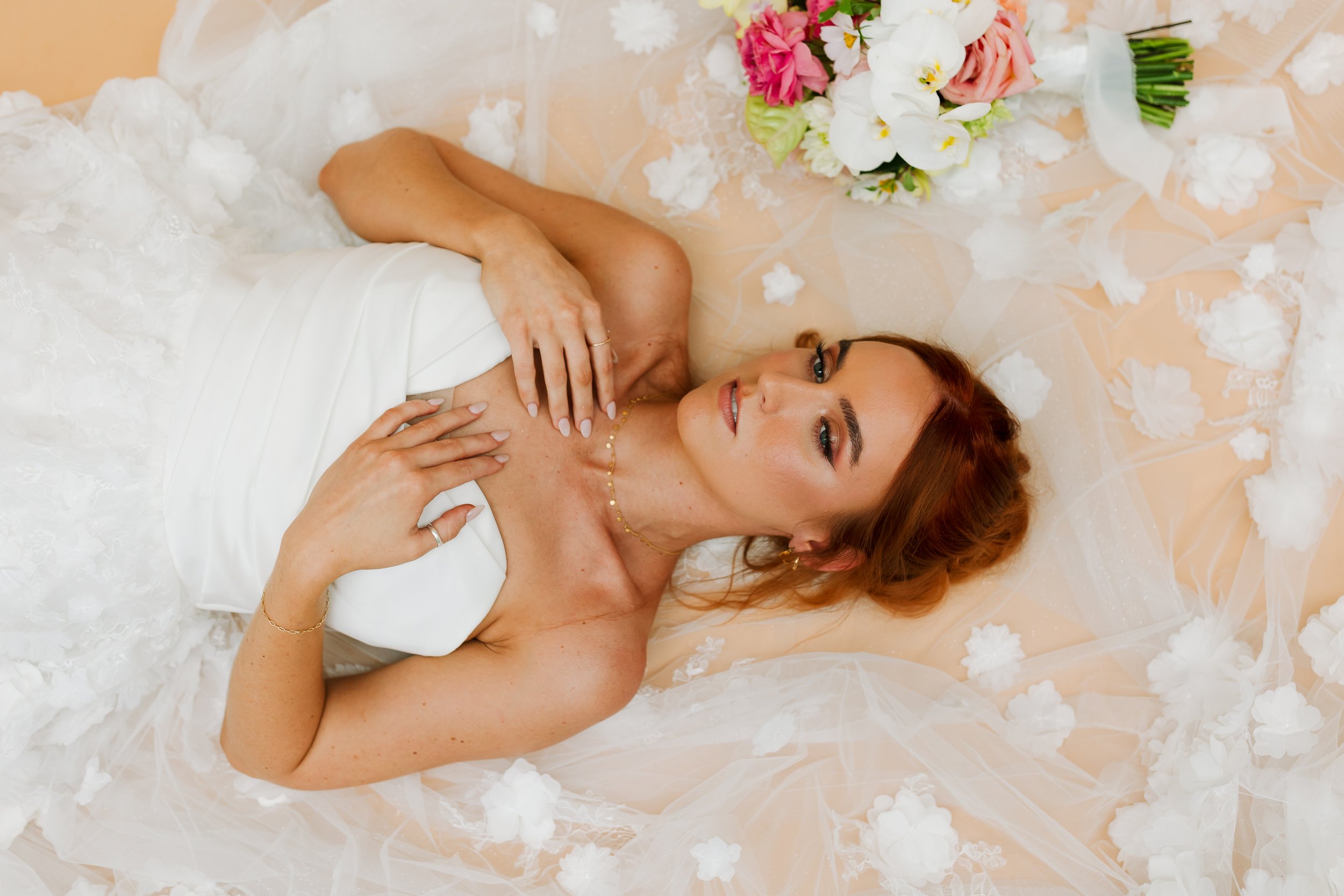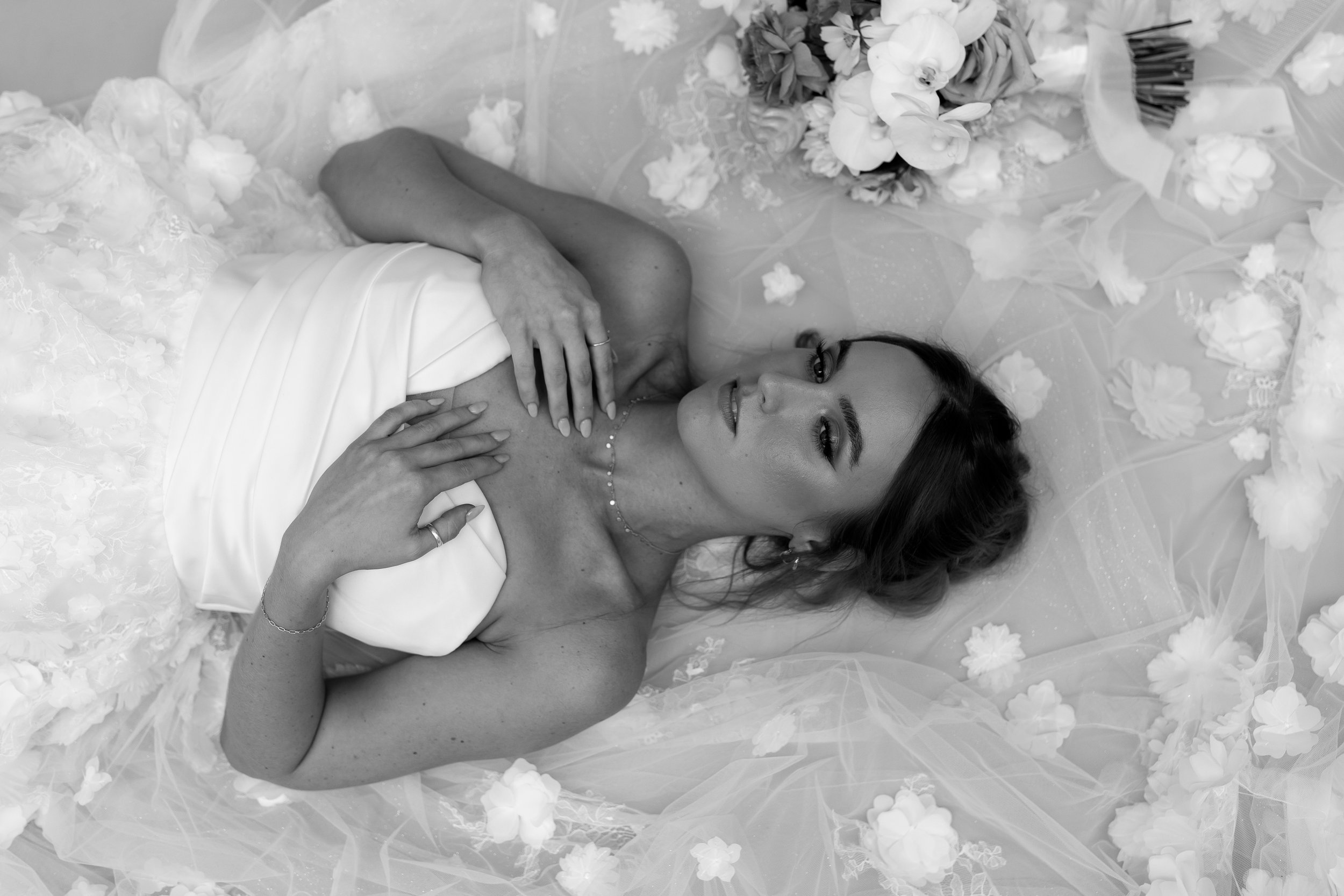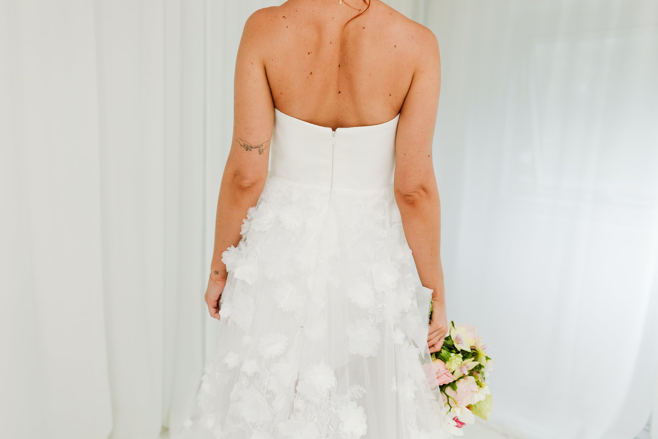 This breathtaking gown is a bit of a fan favourite! We’ve done her as a high-low, with a detachable skirt or used fabric as a mini. She’s totally customisable – or keep her as is! Isn’t she a cutie? The stunning glitter tulle, topped with chantilily lace and floral applique makes the skirt not only super dreamy but also carefully thought out with an eye for bridal fashion chasing the wow moment. The underlay is able to be fully lined for a more traditional look.