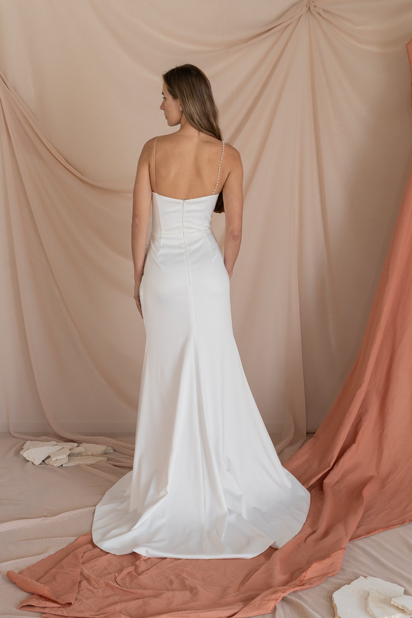 This stunning gown features a pearl neck lining, soft sating and a fitted skirt. Beautifully minimal meets fun.