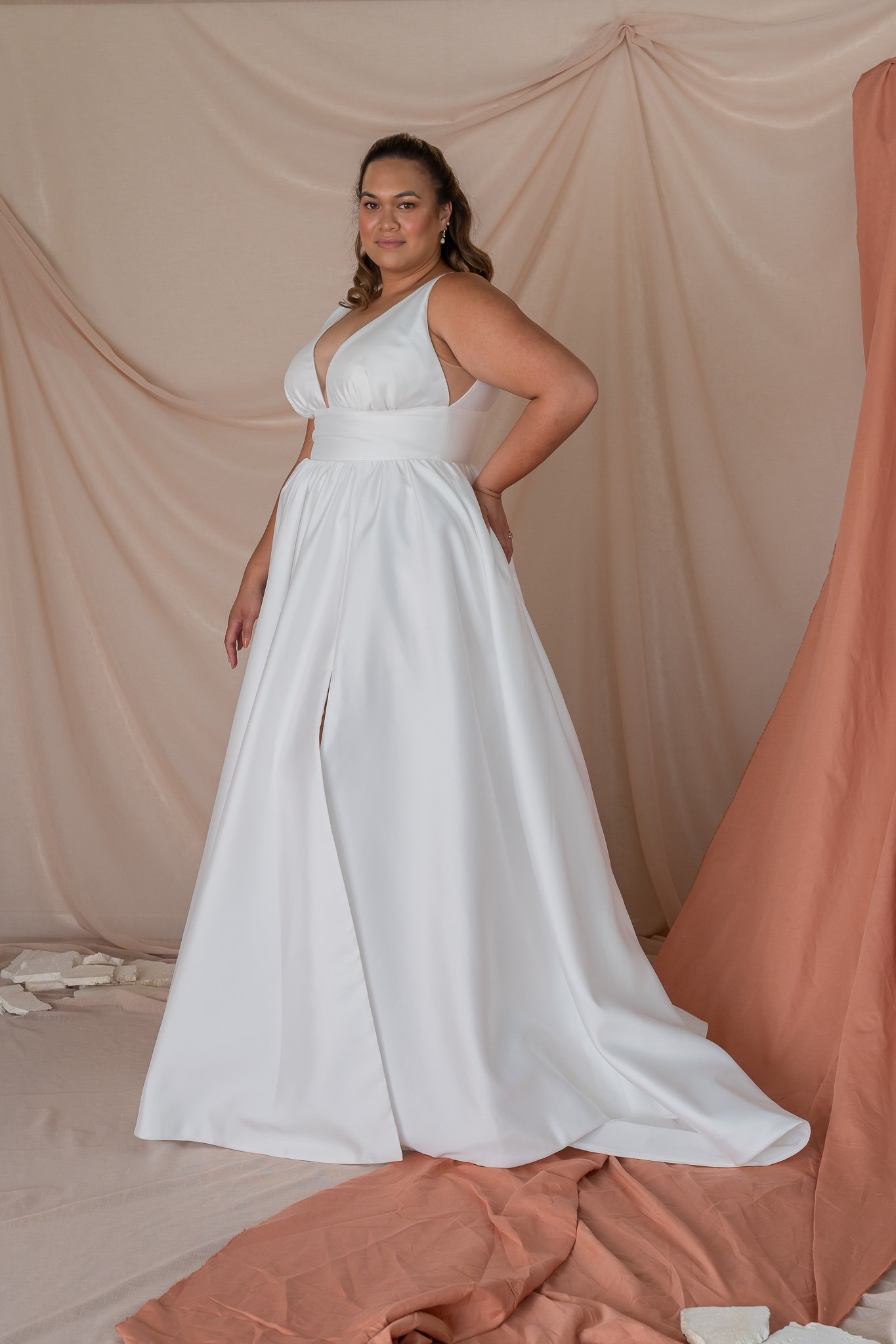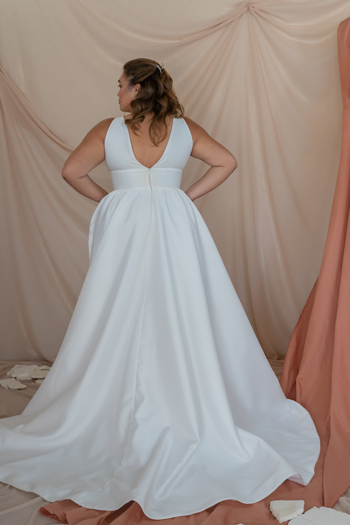 The stunning Dana gown gives a beautiful v-neck bodice with a flowy skirt. The bodice is very contemporary and fun. Perfect to pair with a long dramatic veil, fun bridal sleeves or pearl earrings.