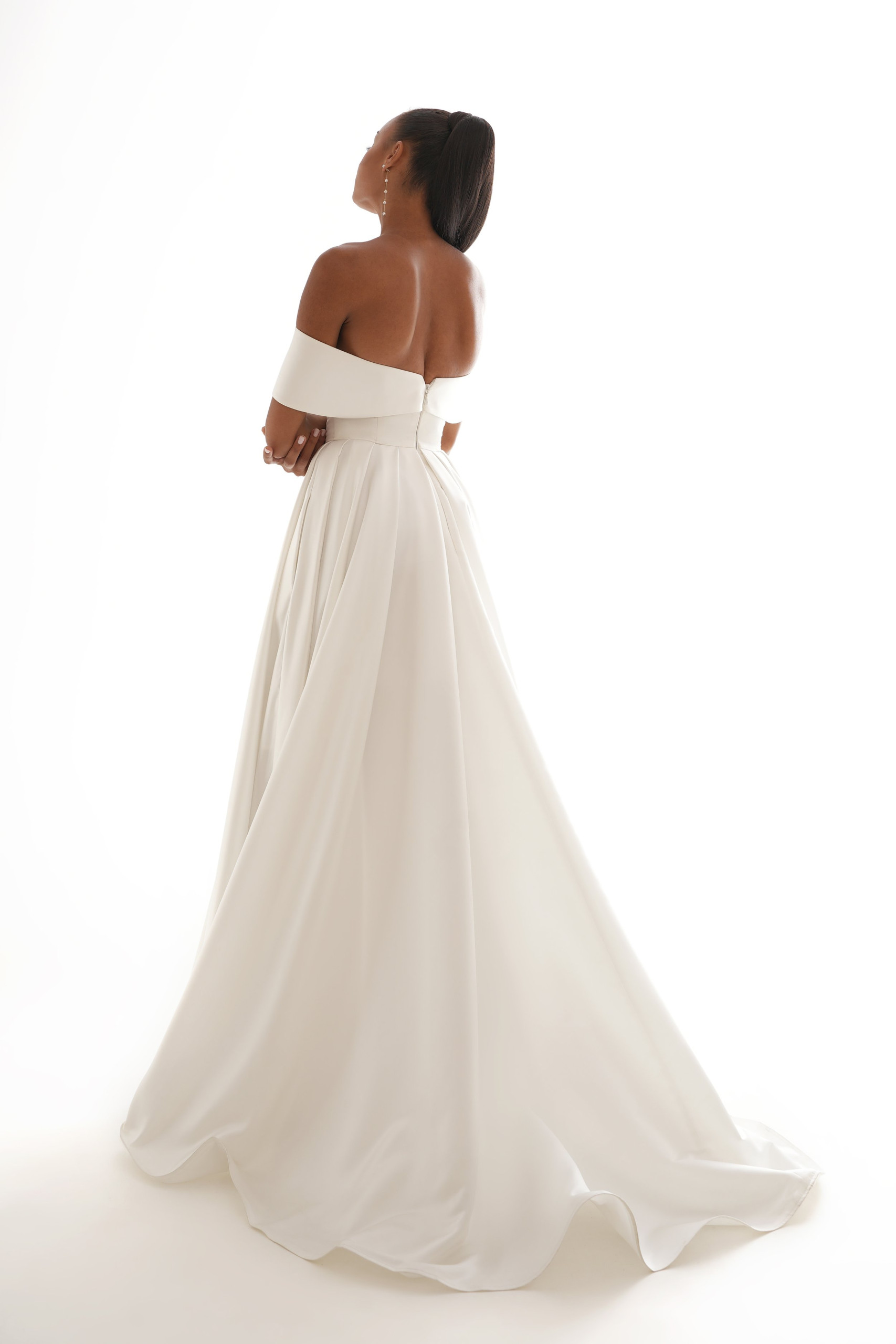 When a picture tells a thousand words need we say much? The Madonna gown is simple yet elegant and timeless. The side straps give it that little something as the skirt flows out.