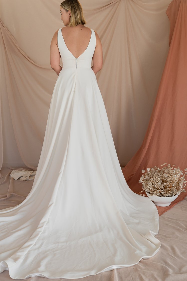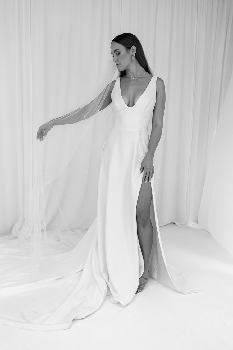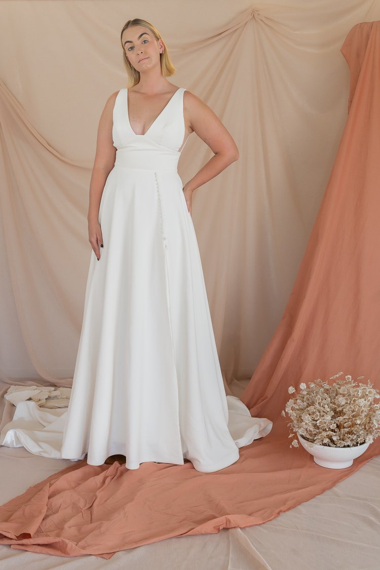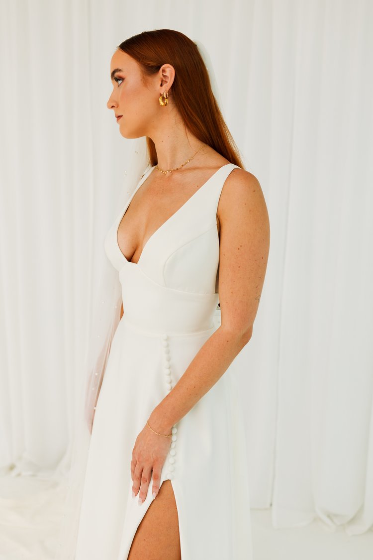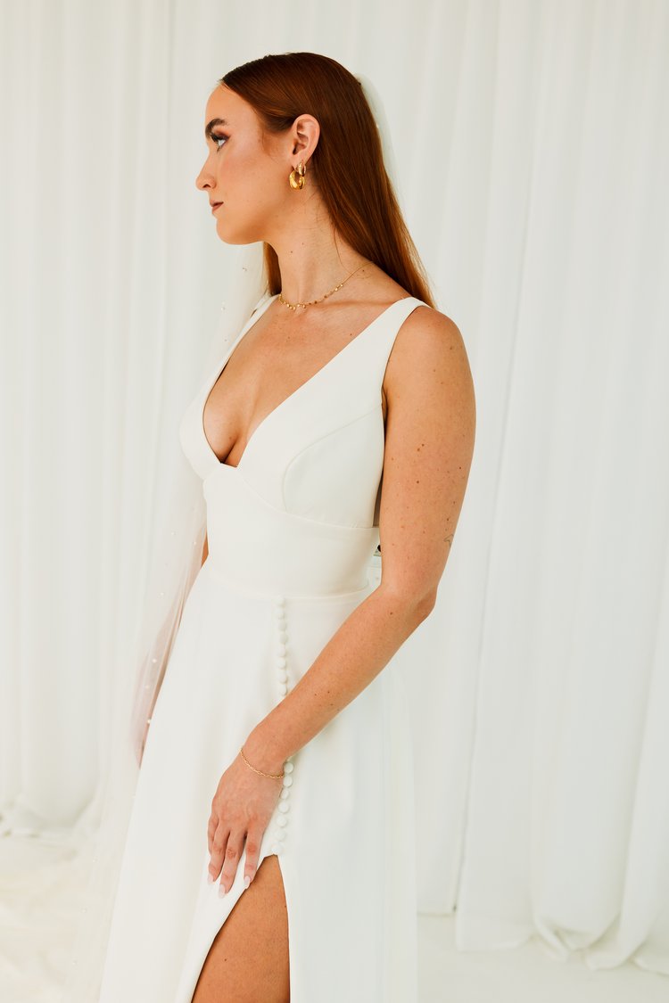 Our “Winnie” gown is so flattering on every body. The secret behind this gown is the stunning luxury crepe which fits and flows to perfection. The gap v neck and sheer side gives it a gorgeous look. Finished off with a leg split and buttons to give it a modern and stylish aesthetic.