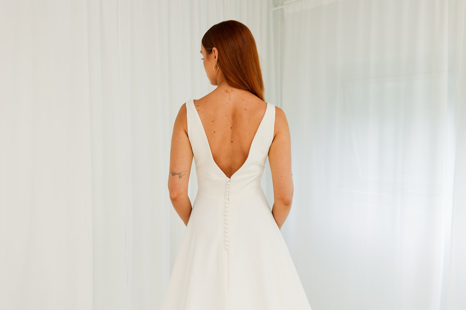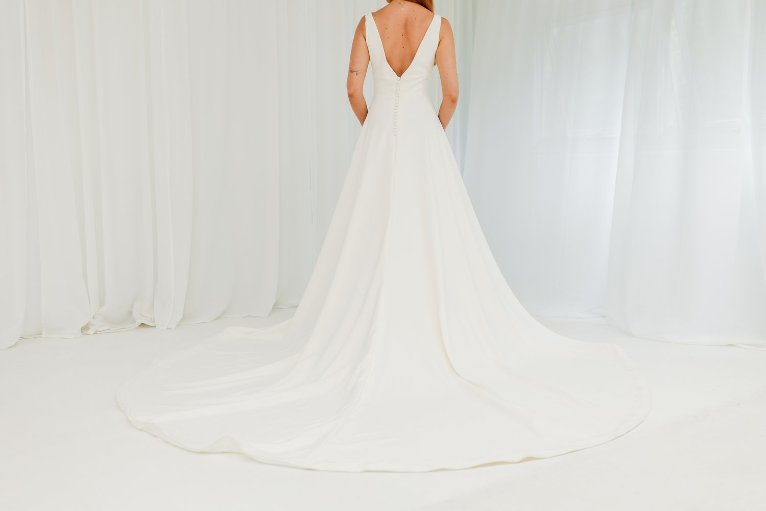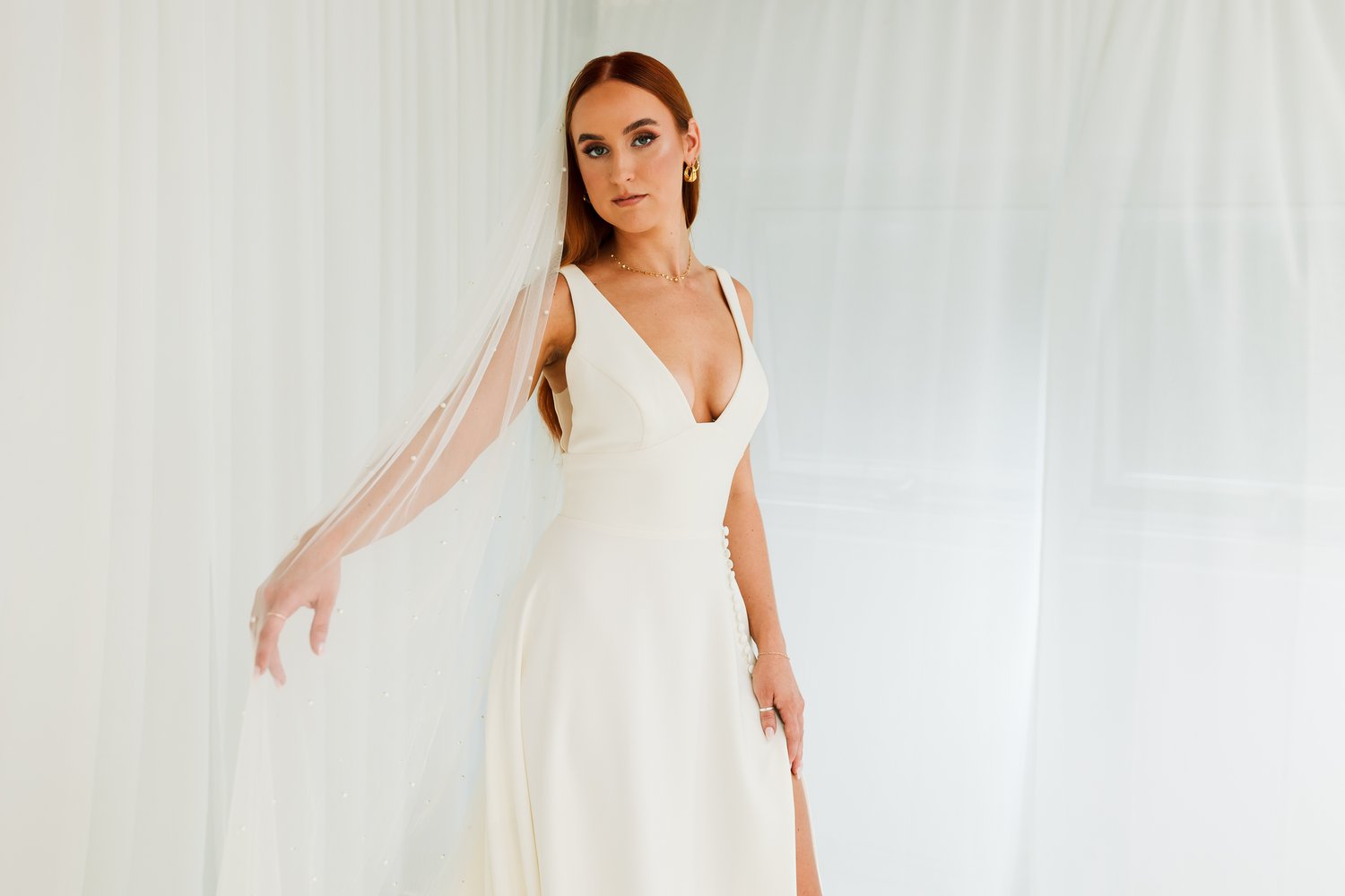 Our “Winnie” gown is so flattering on every body. The secret behind this gown is the stunning luxury crepe which fits and flows to perfection. The gap v neck and sheer side gives it a gorgeous look. Finished off with a leg split and buttons to give it a modern and stylish aesthetic.