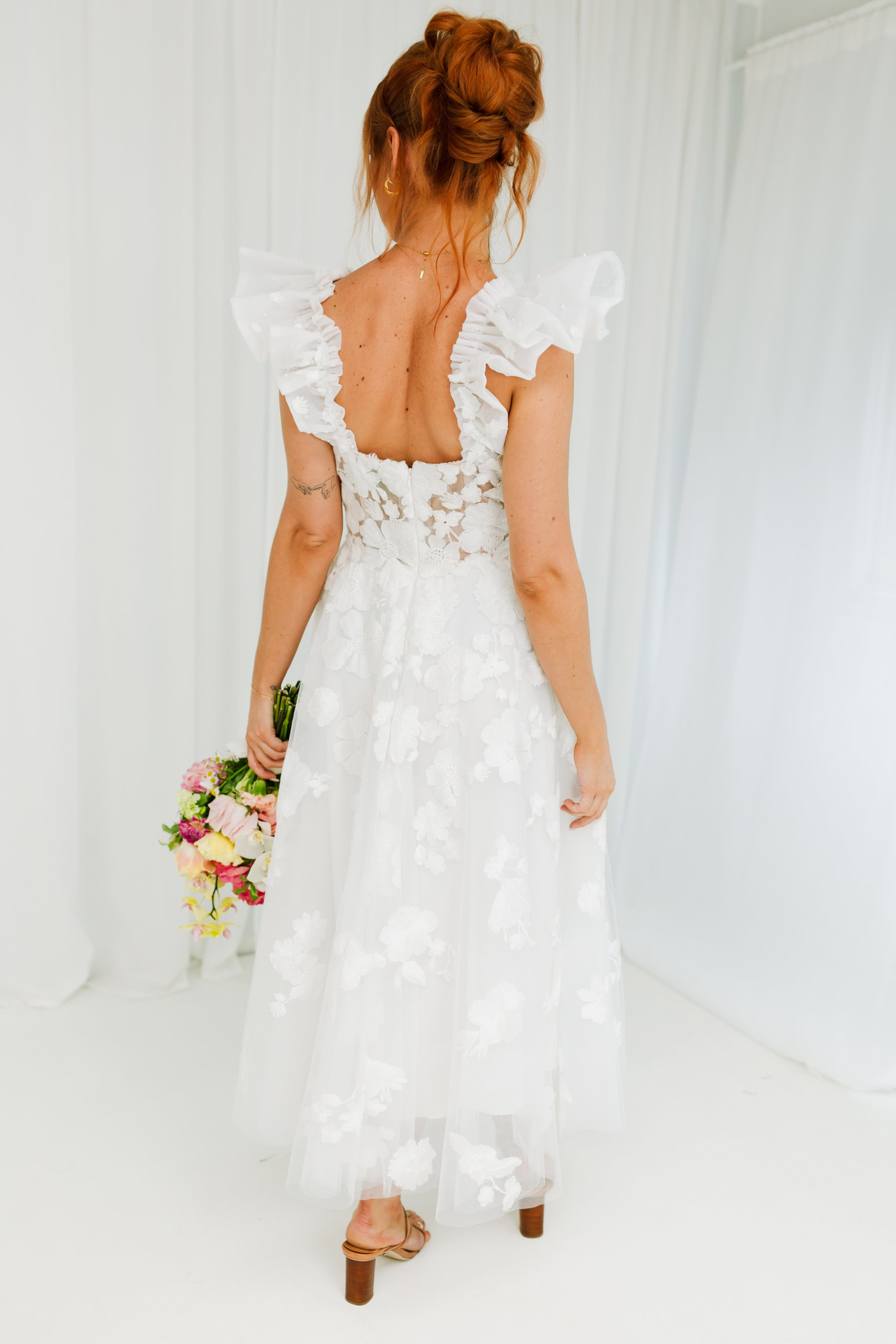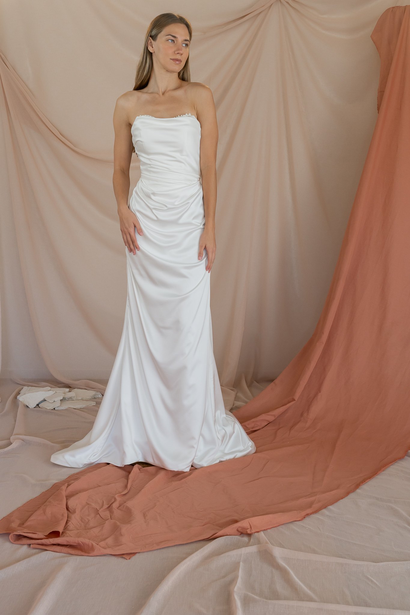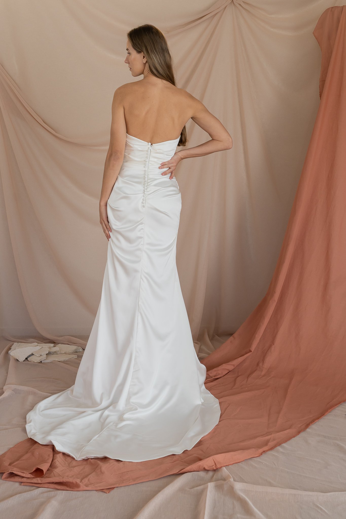 This stunning one shoulder design is so chic and flattering. It features a side zipper, split and buttons for an edgy but fun design. The material is a soft crepe which gives a beautiful flowy effect.