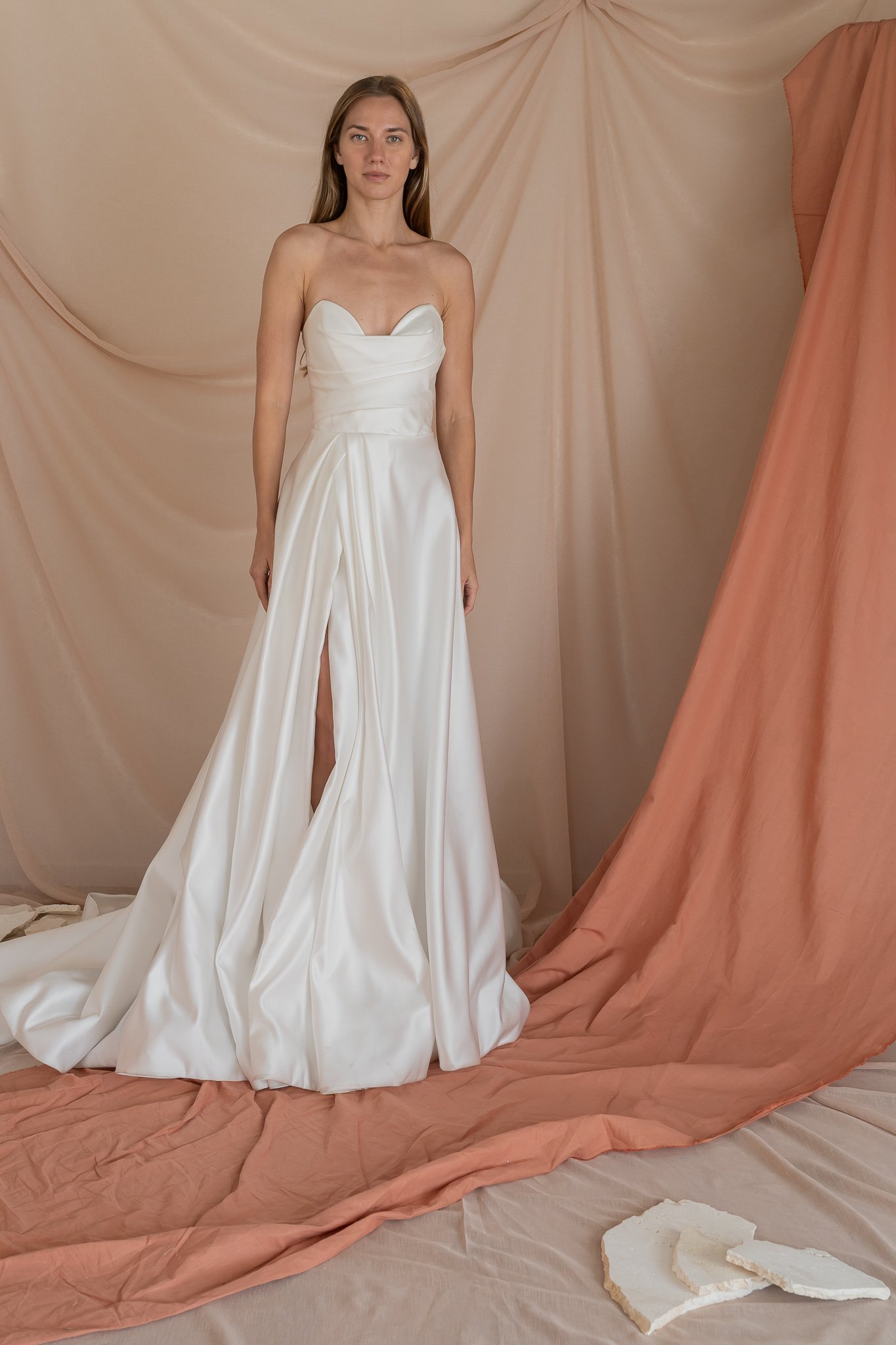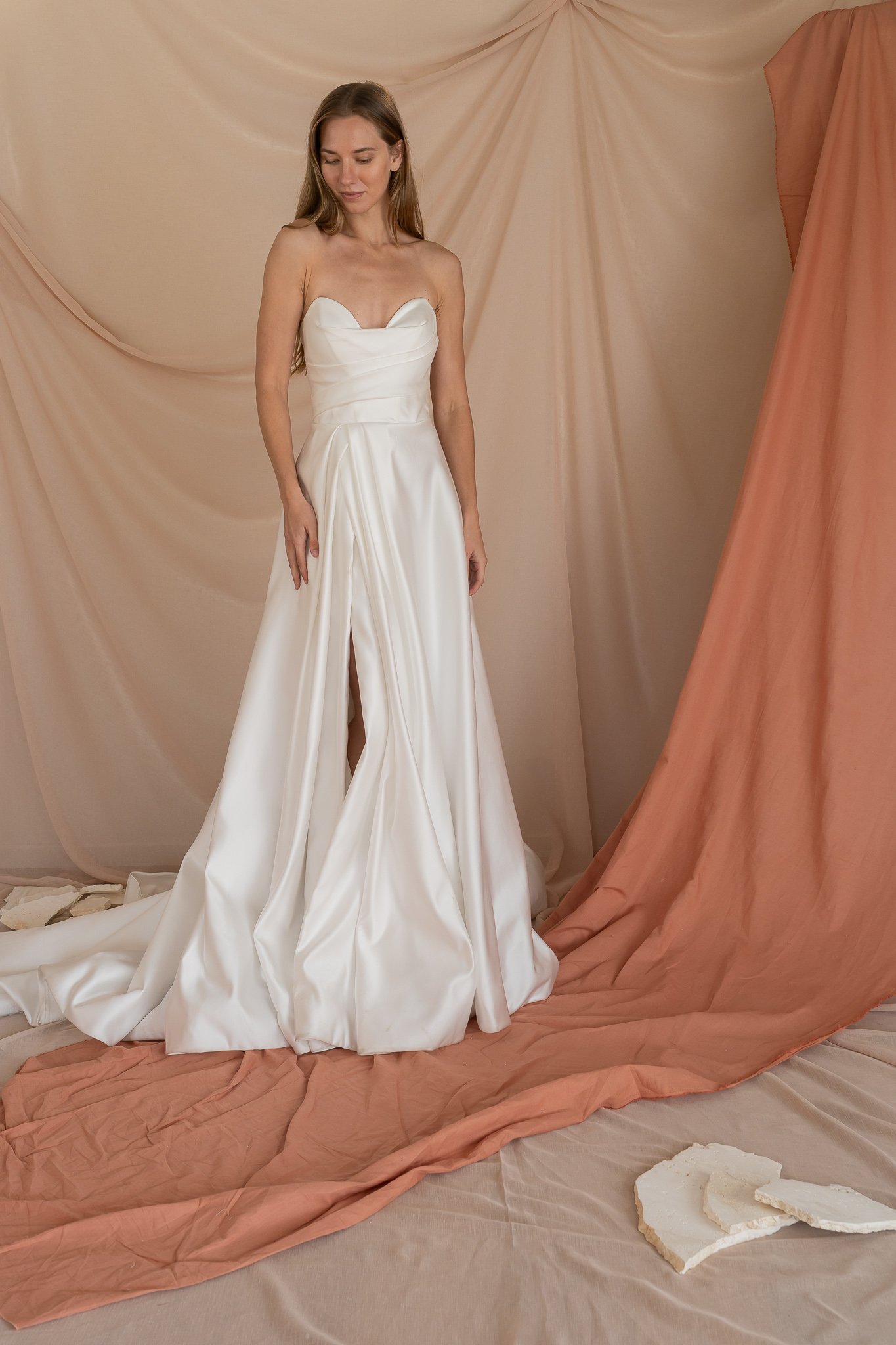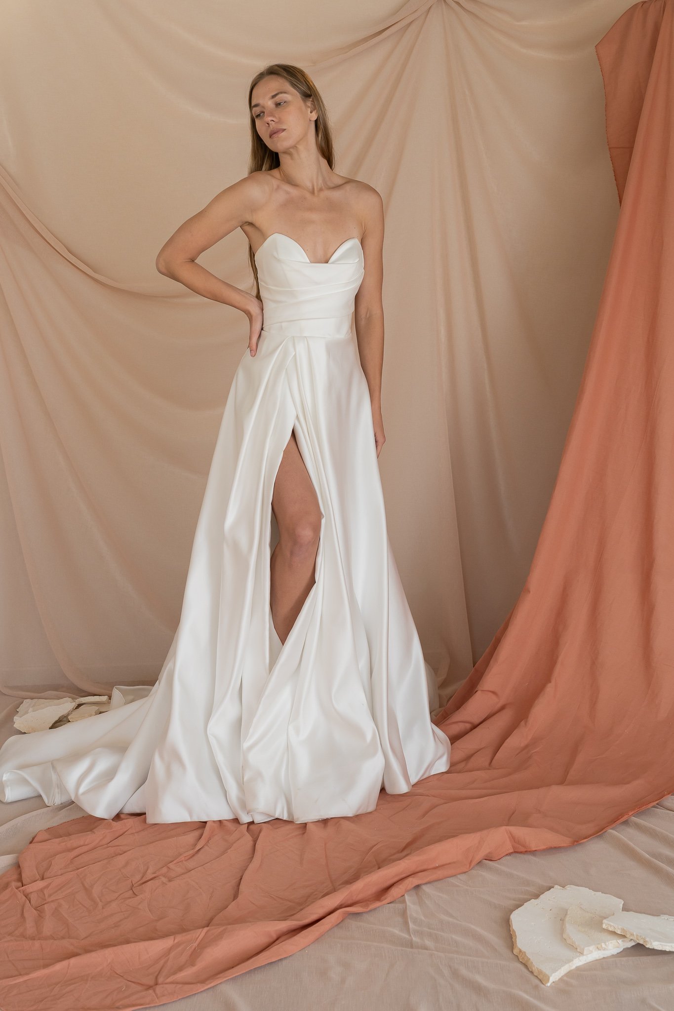 Turn up the heat in our strapless satin dress with a sultry high leg split. This dress is the epitome of modern glamour, designed to make you stand out at any event. Its sleek and minimalist silhouette hugs your curves while the thigh-high slit adds an alluring edge.