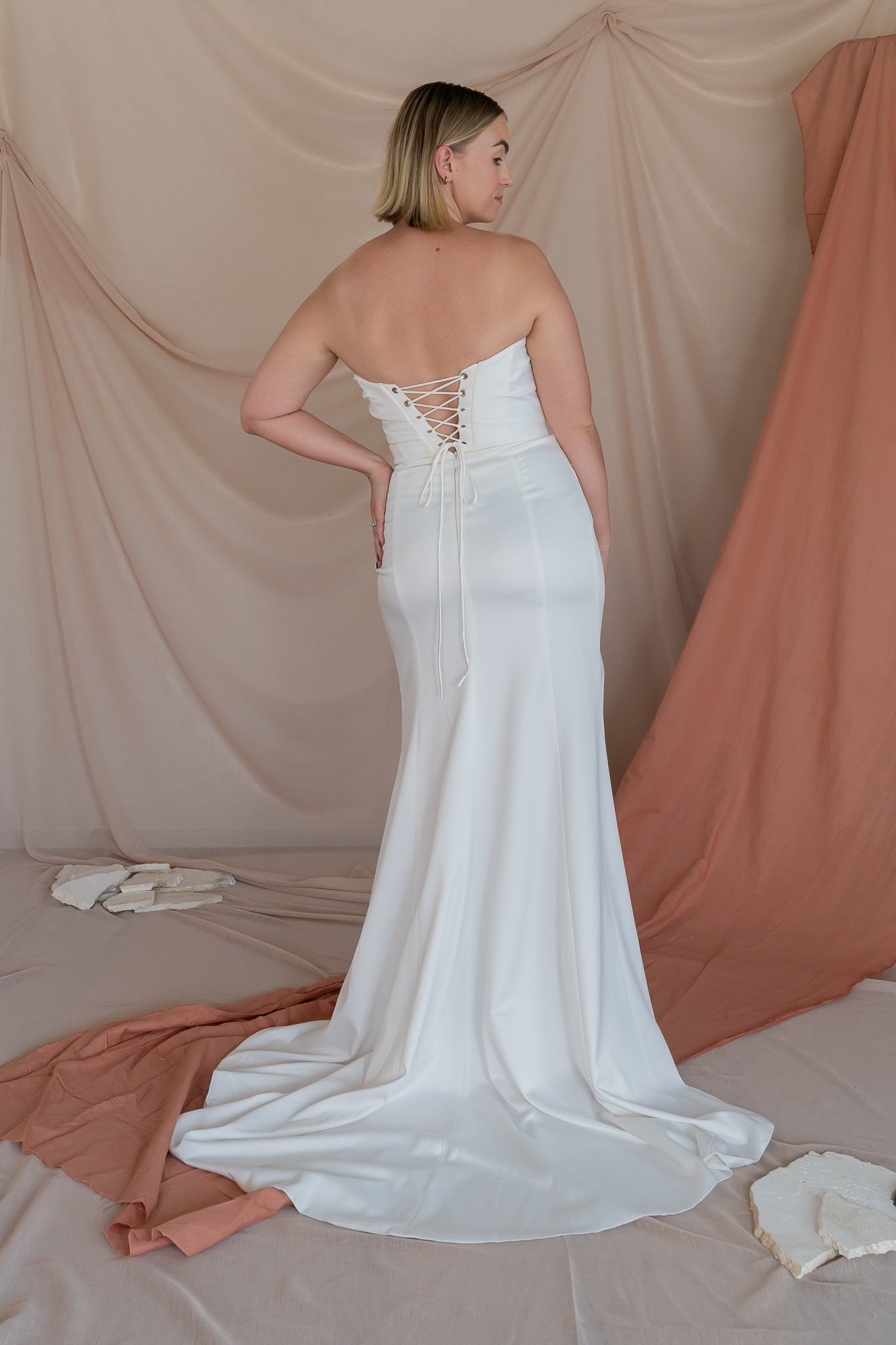 This gown has the most beautiful detailing on the bodice finished with a gorgeous skirt split. It screams minimal but with a hint of drama.