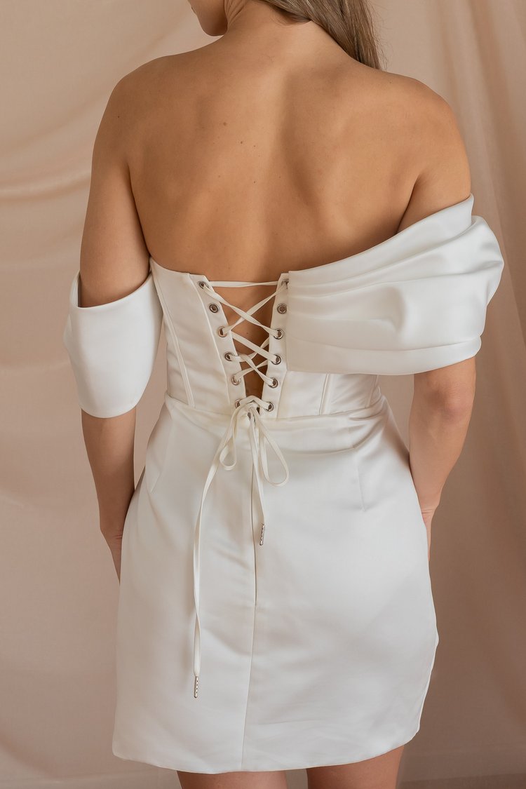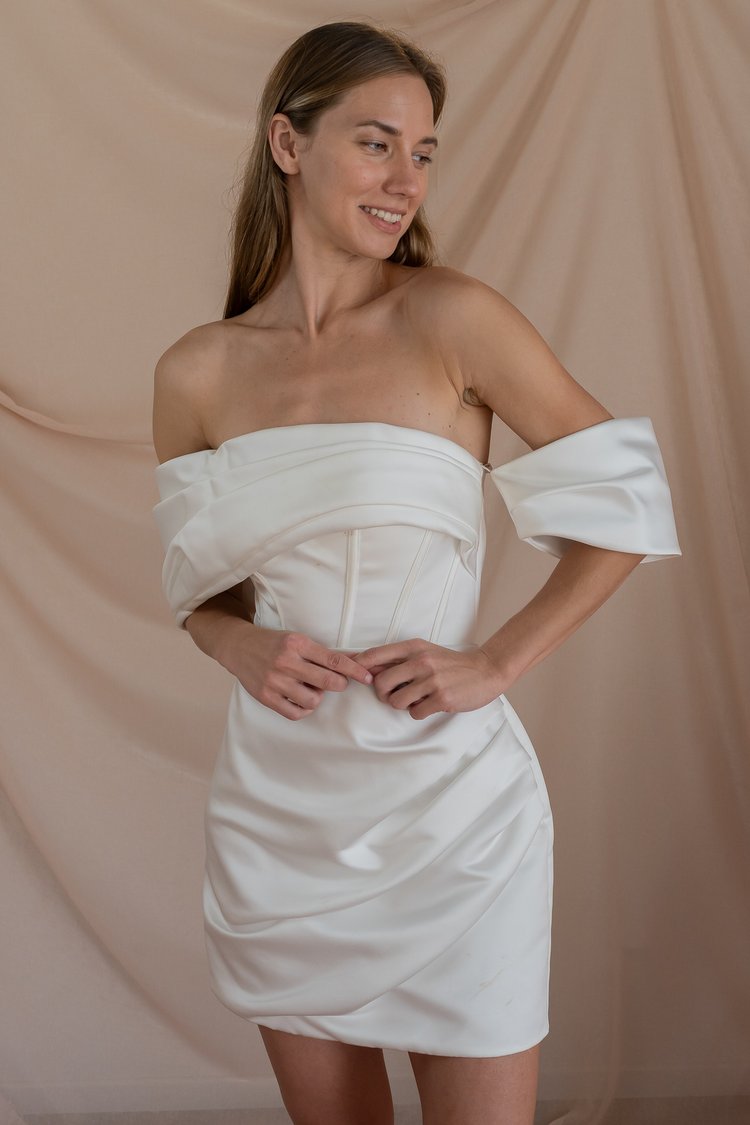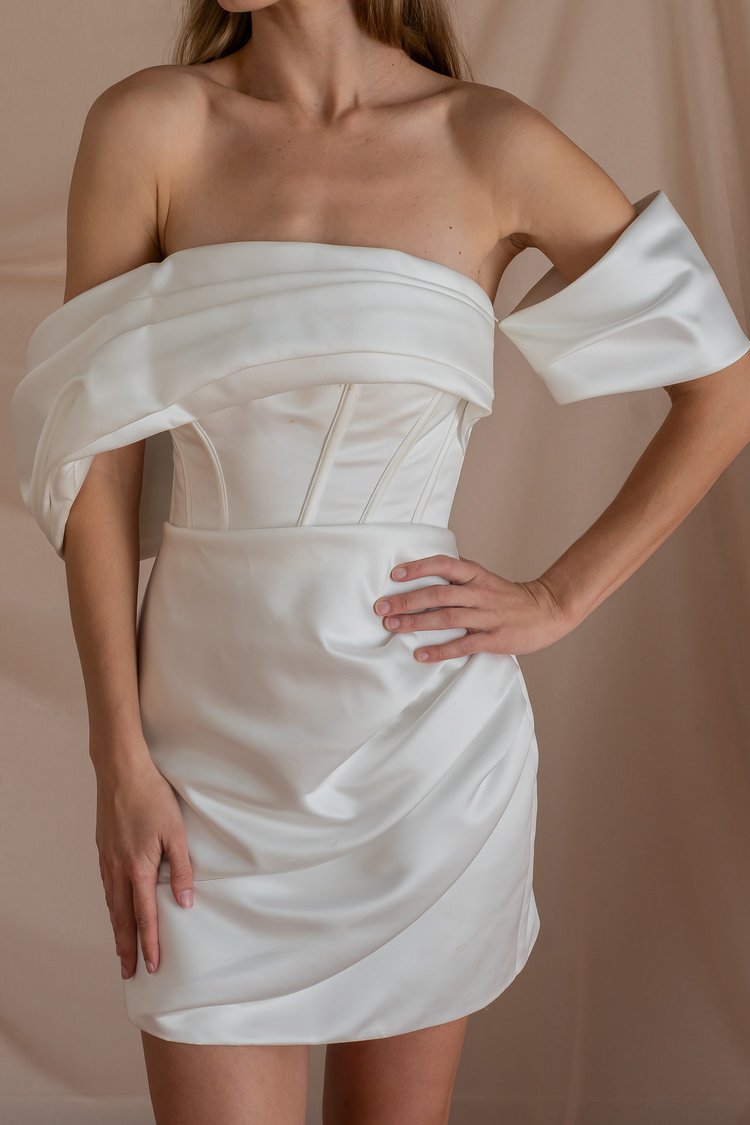Introducing our minimalistic mini reception dress, designed for versatility. Its clean lines and understated elegance make it perfect for a chic celebration. And when you’re ready to add a touch of glamour, simply pair it with the included satin overskirt for a stunning transformation.
