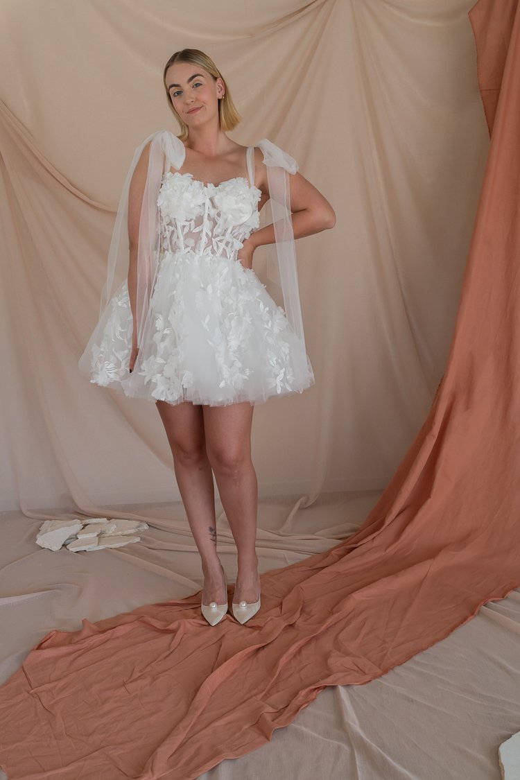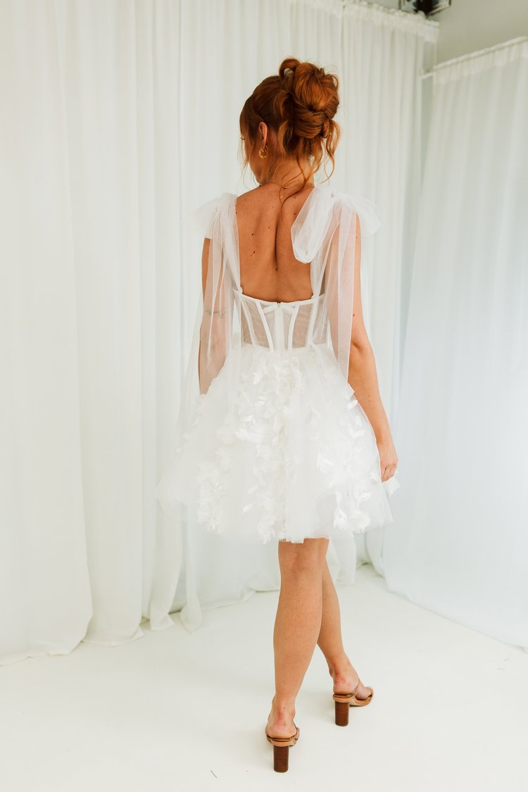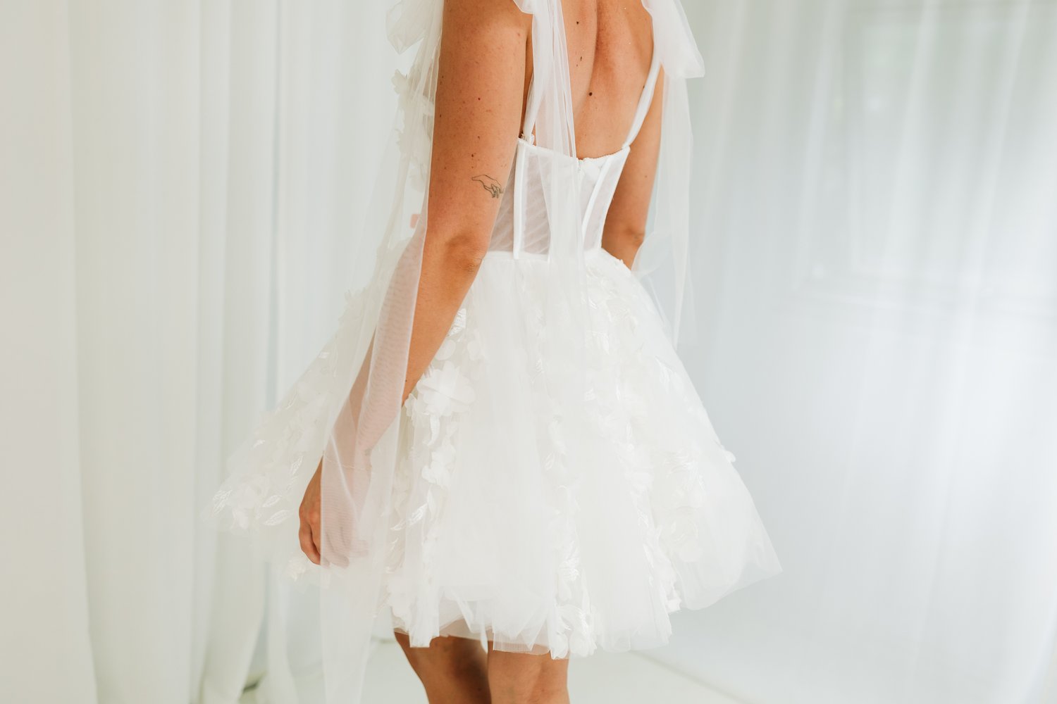 Our Lili gown is all things fun and flirty. Featuring a short skirt and fun little details, it’s so unique. Perfect for an intimate wedding or as a second reception look. She flows and dances around like none other.