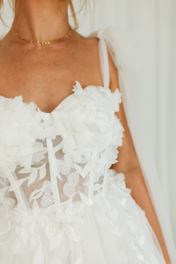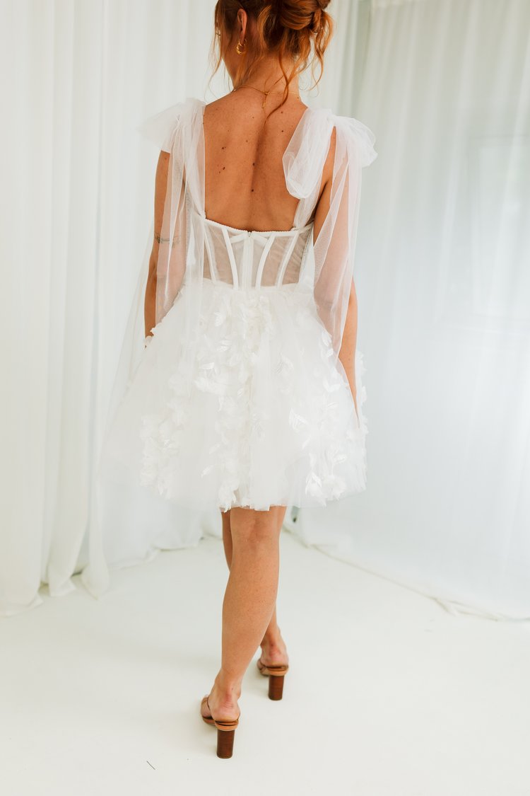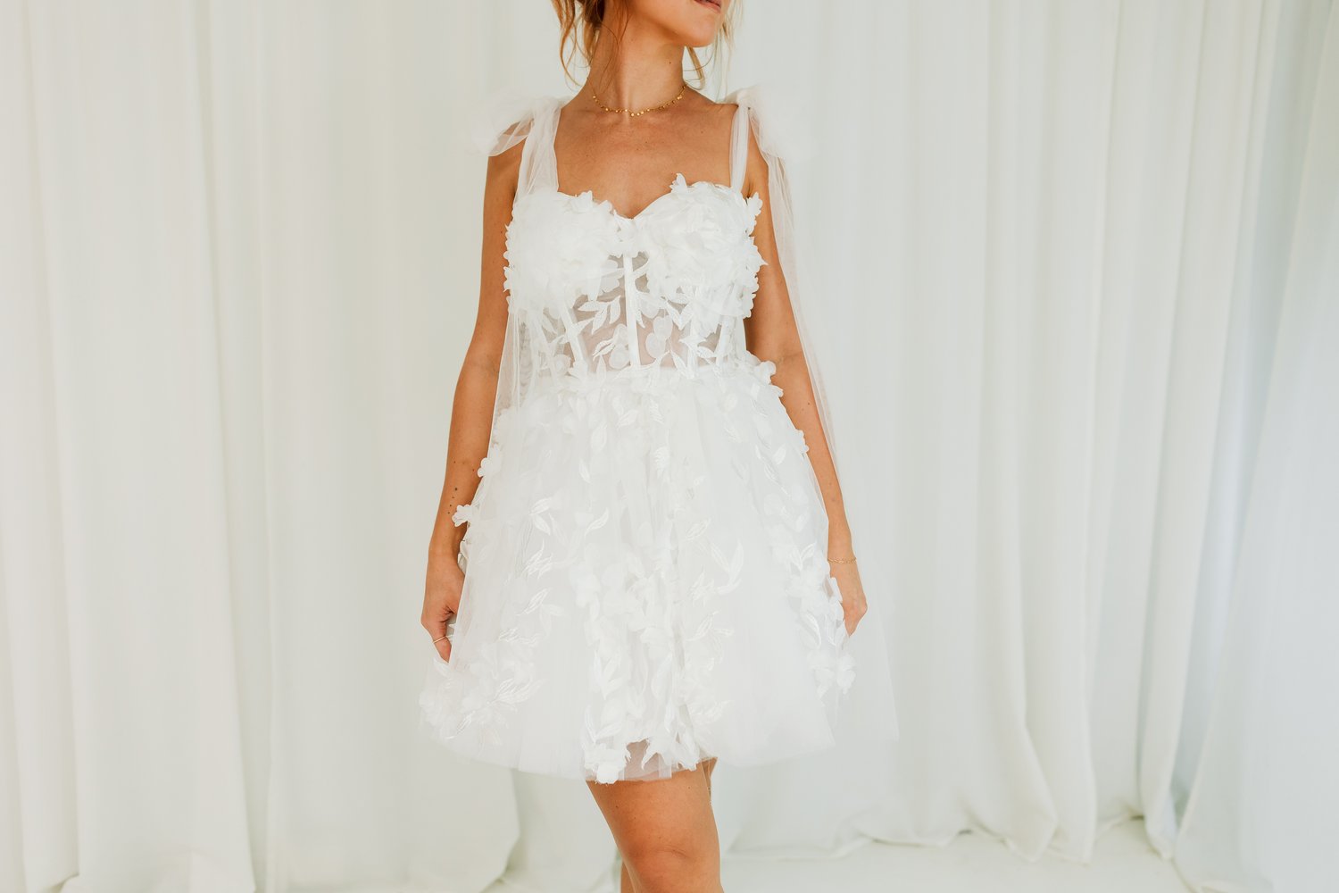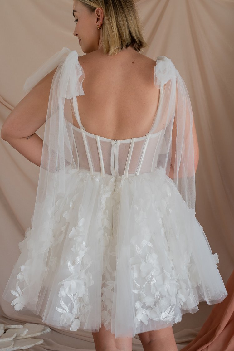 Our Lili gown is all things fun and flirty. Featuring a short skirt and fun little details, it’s so unique. Perfect for an intimate wedding or as a second reception look. She flows and dances around like none other.