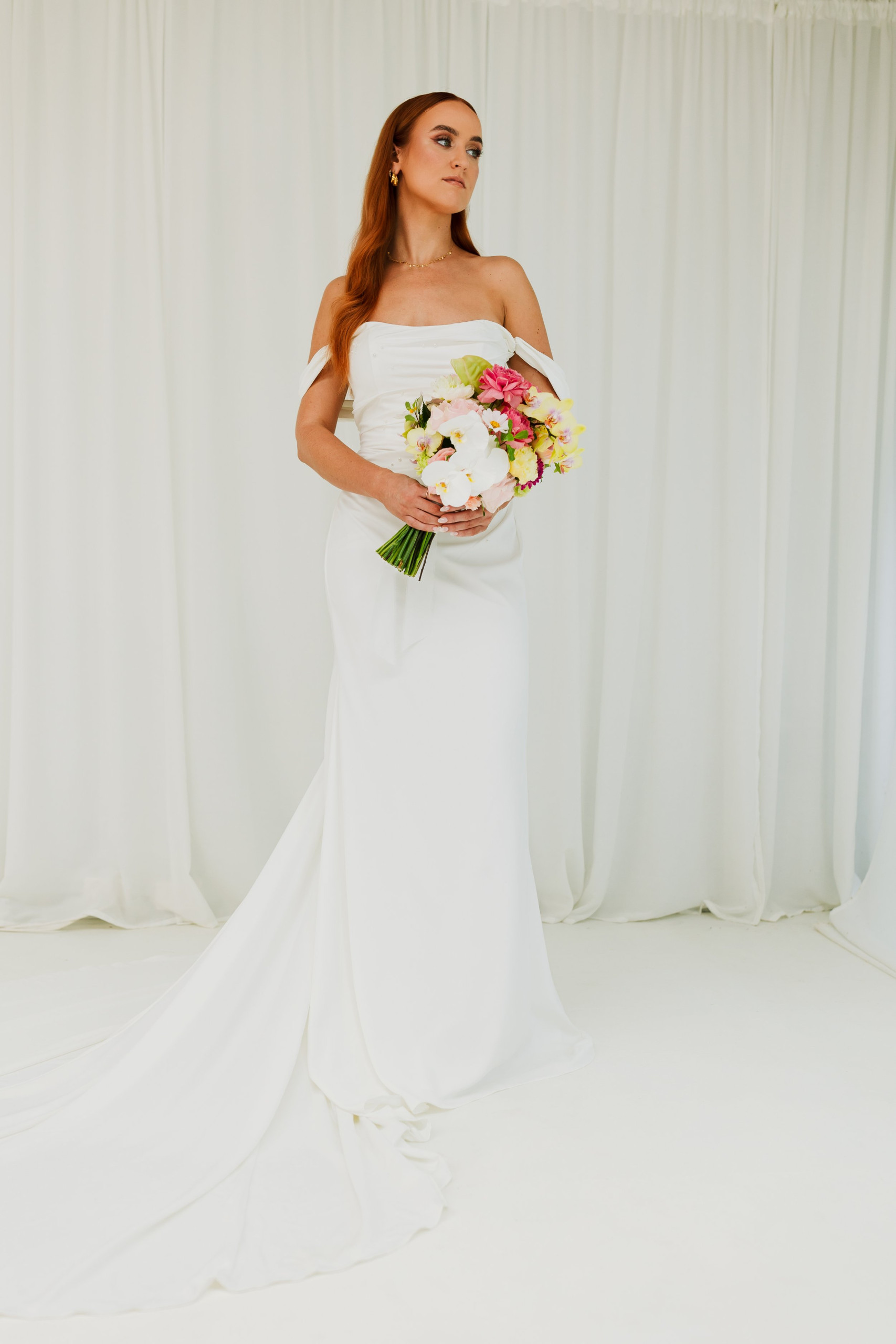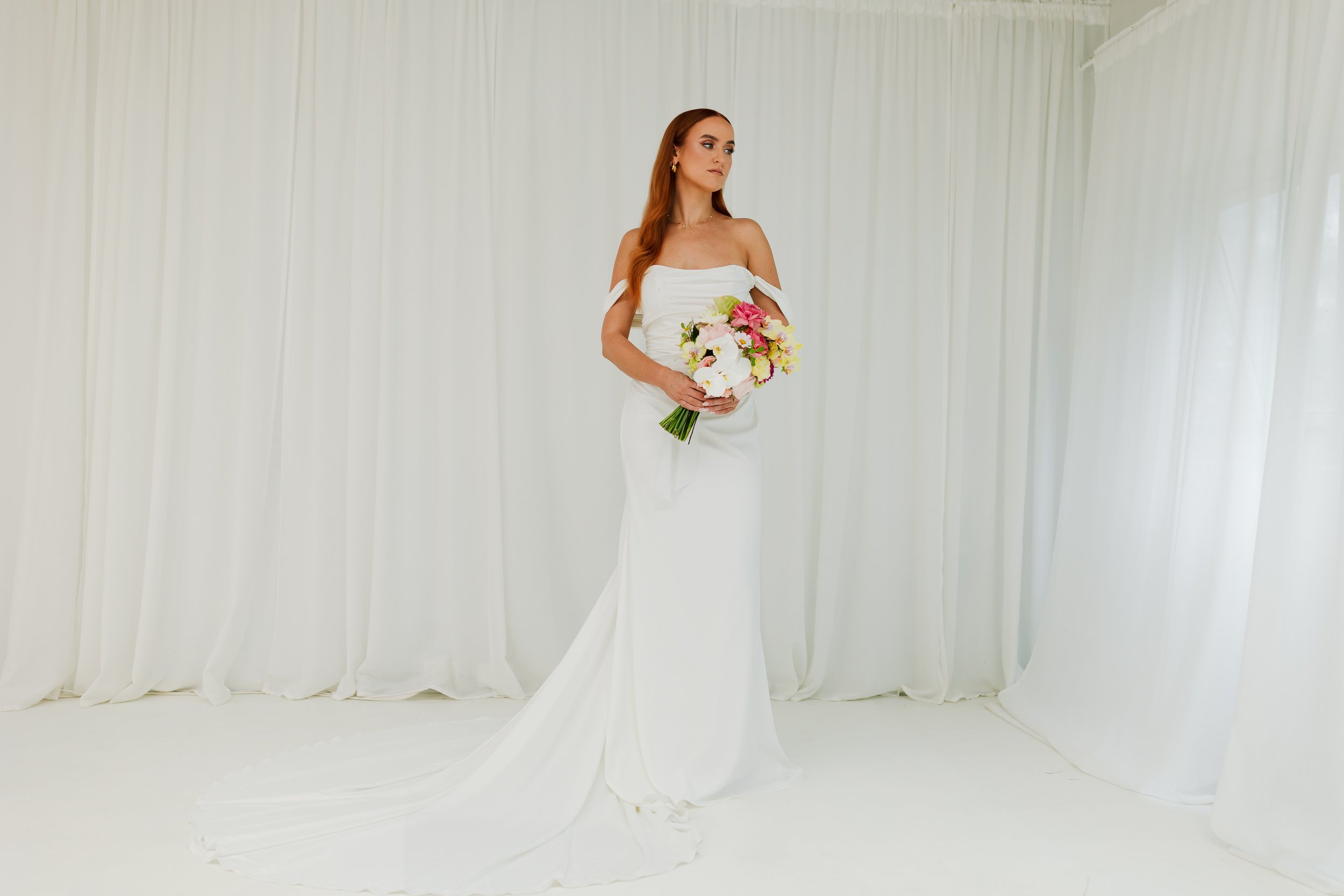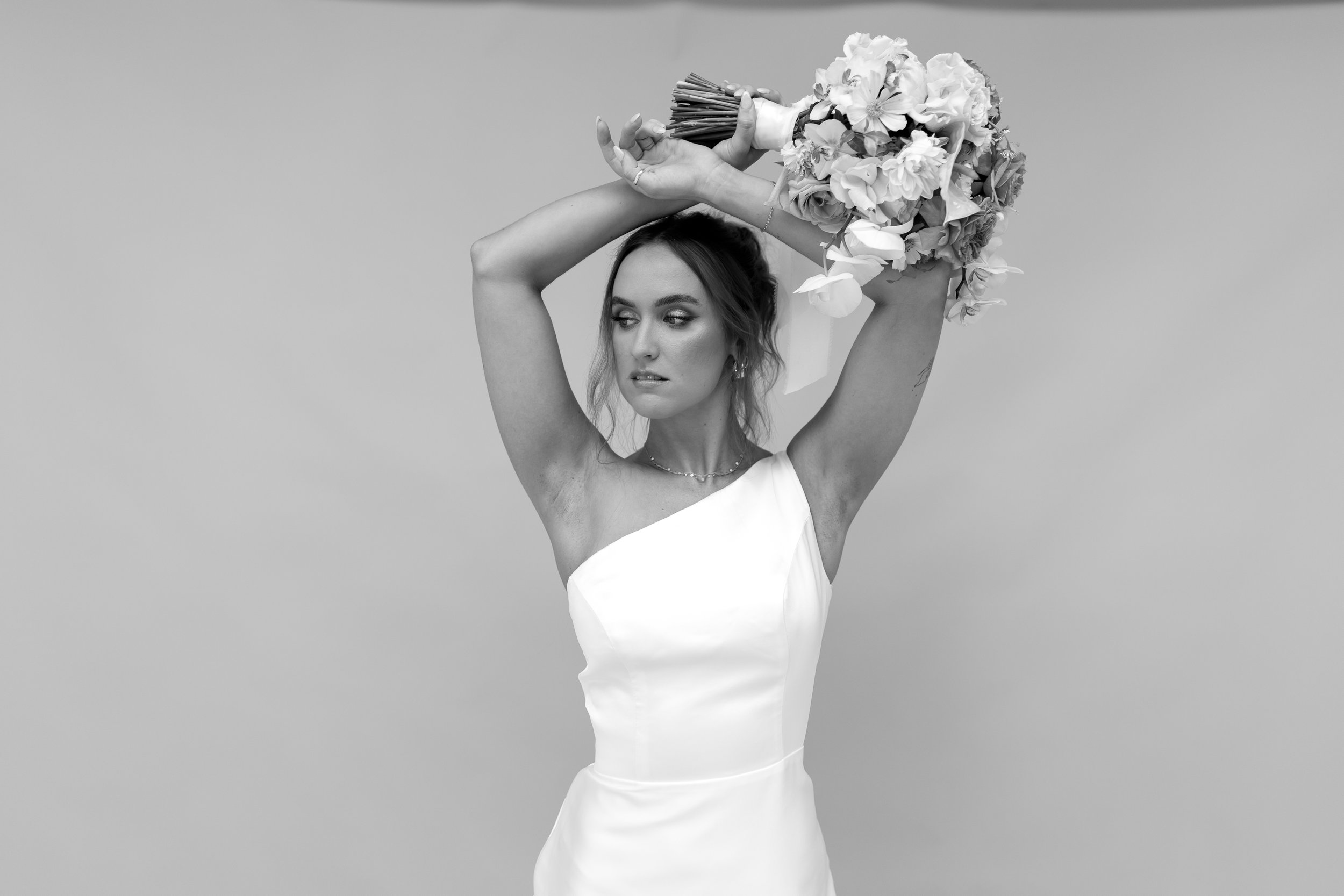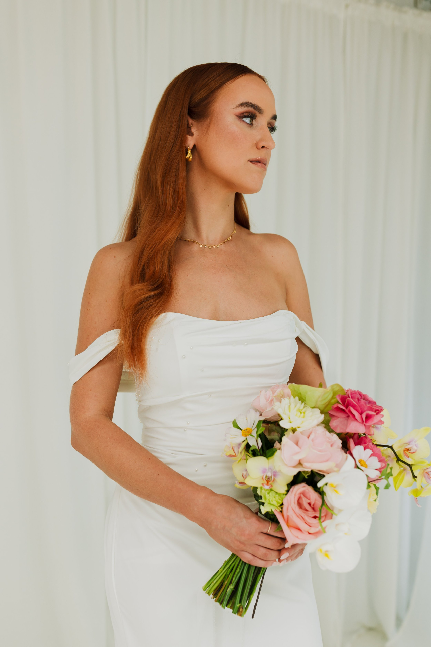 This breathtaking gown is a bit of a fan favourite! We’ve done her as a high-low, with a detachable skirt or used fabric as a mini. She’s totally customisable – or keep her as is! Isn’t she a cutie? The stunning glitter tulle, topped with chantilily lace and floral applique makes the skirt not only super dreamy but also carefully thought out with an eye for bridal fashion chasing the wow moment. The underlay is able to be fully lined for a more traditional look.