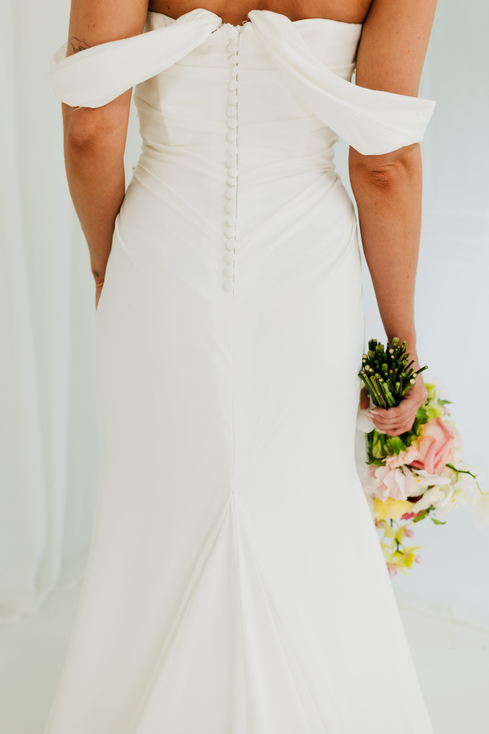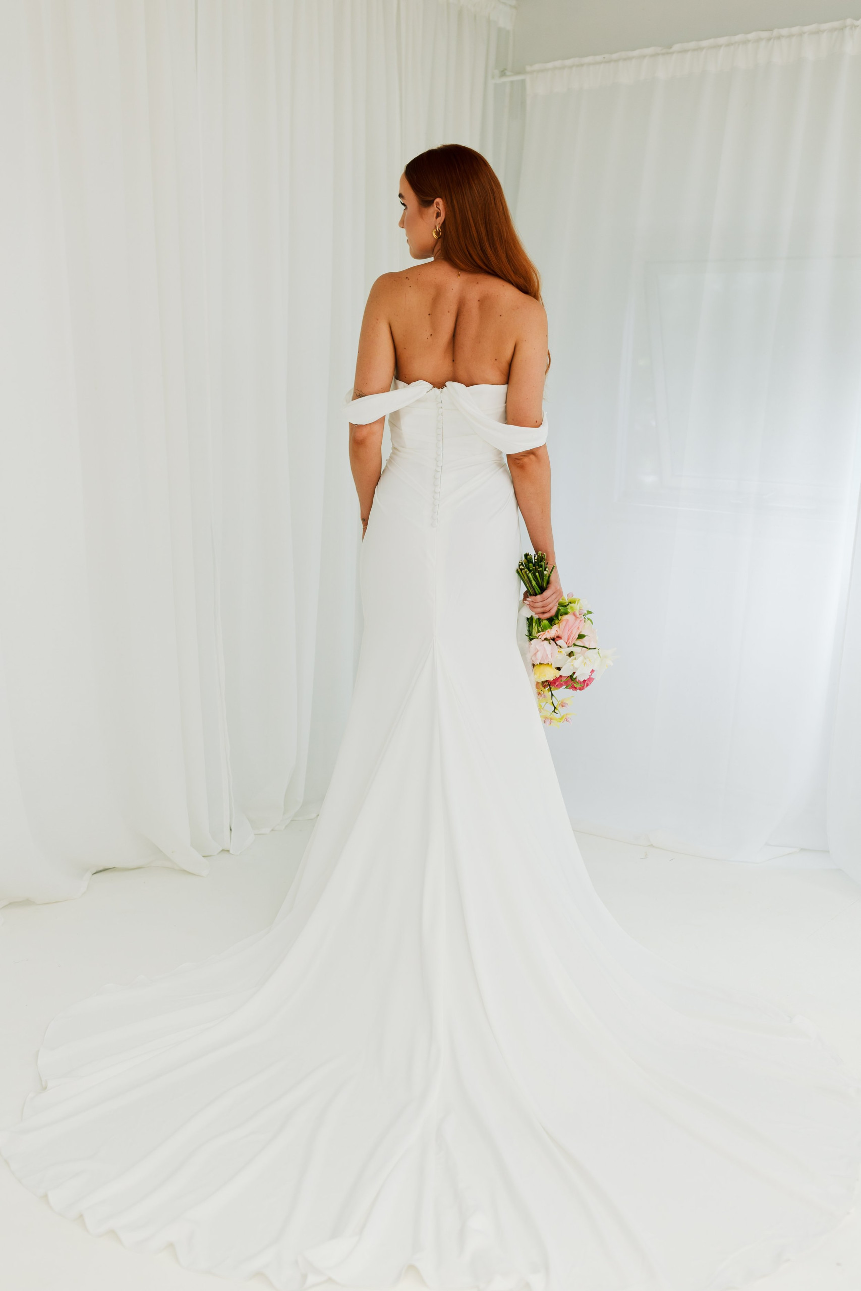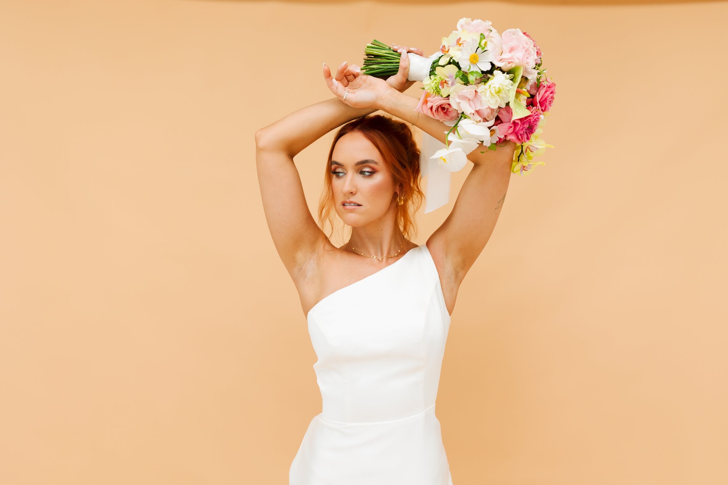 This breathtaking gown is a bit of a fan favourite! We’ve done her as a high-low, with a detachable skirt or used fabric as a mini. She’s totally customisable – or keep her as is! Isn’t she a cutie? The stunning glitter tulle, topped with chantilily lace and floral applique makes the skirt not only super dreamy but also carefully thought out with an eye for bridal fashion chasing the wow moment. The underlay is able to be fully lined for a more traditional look.
