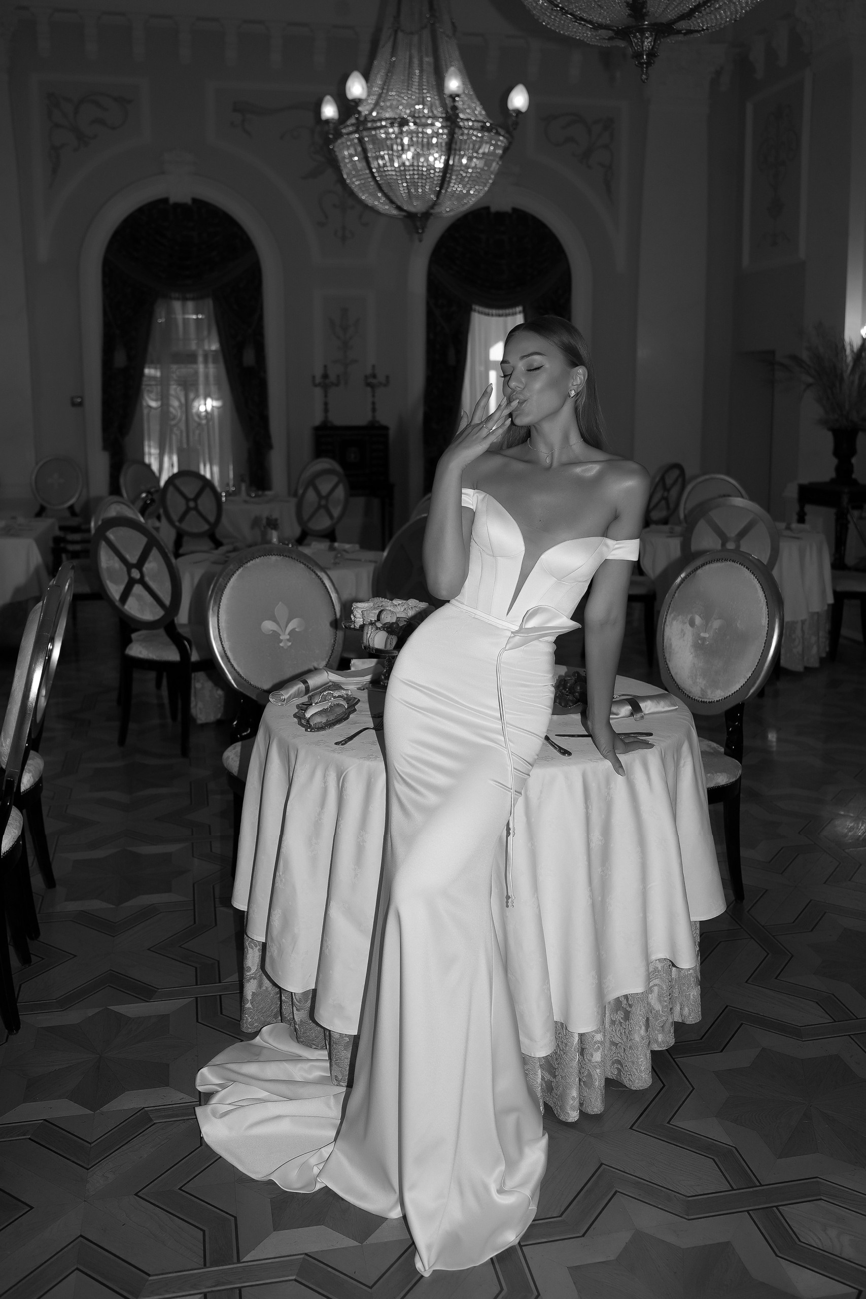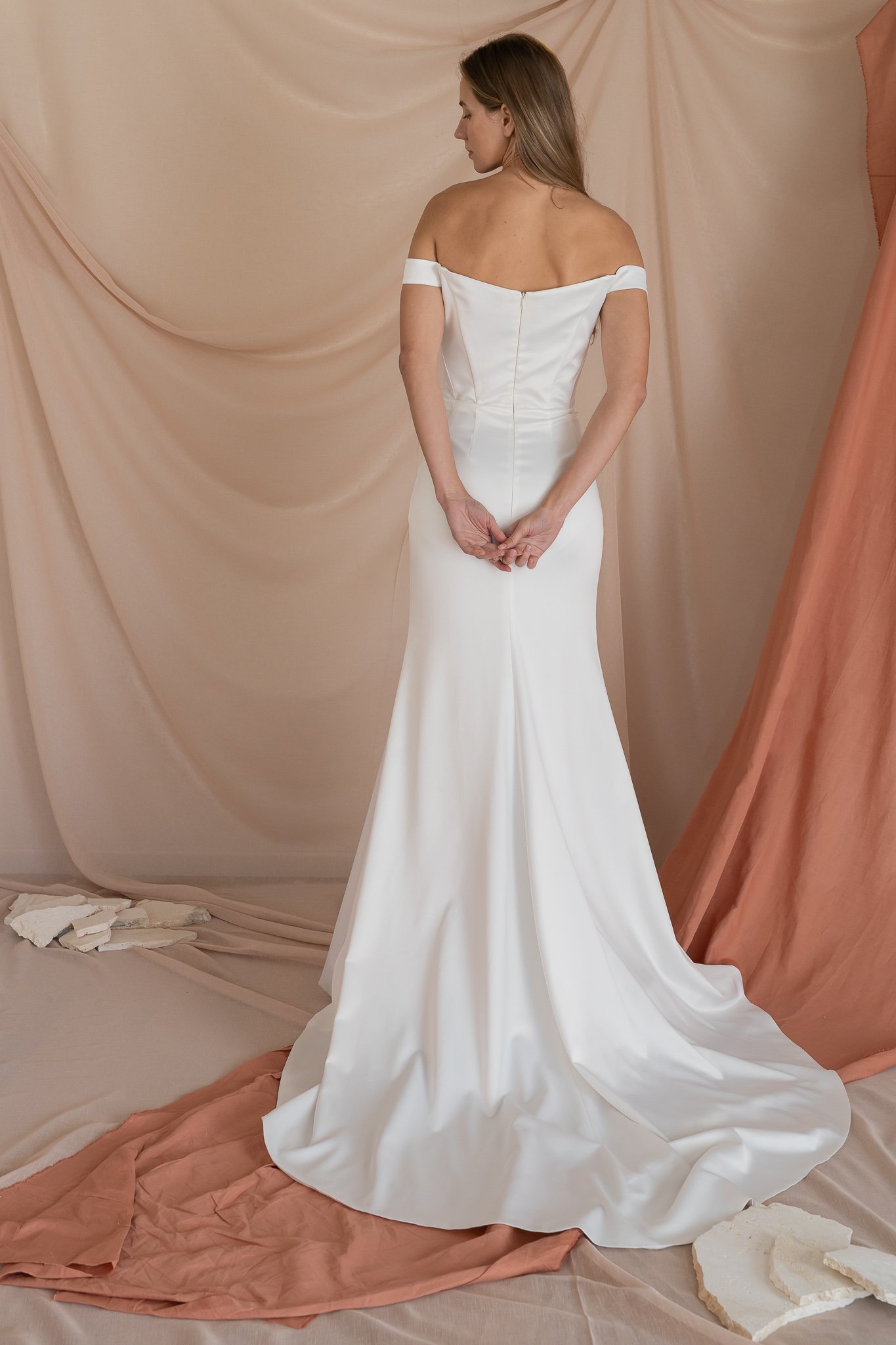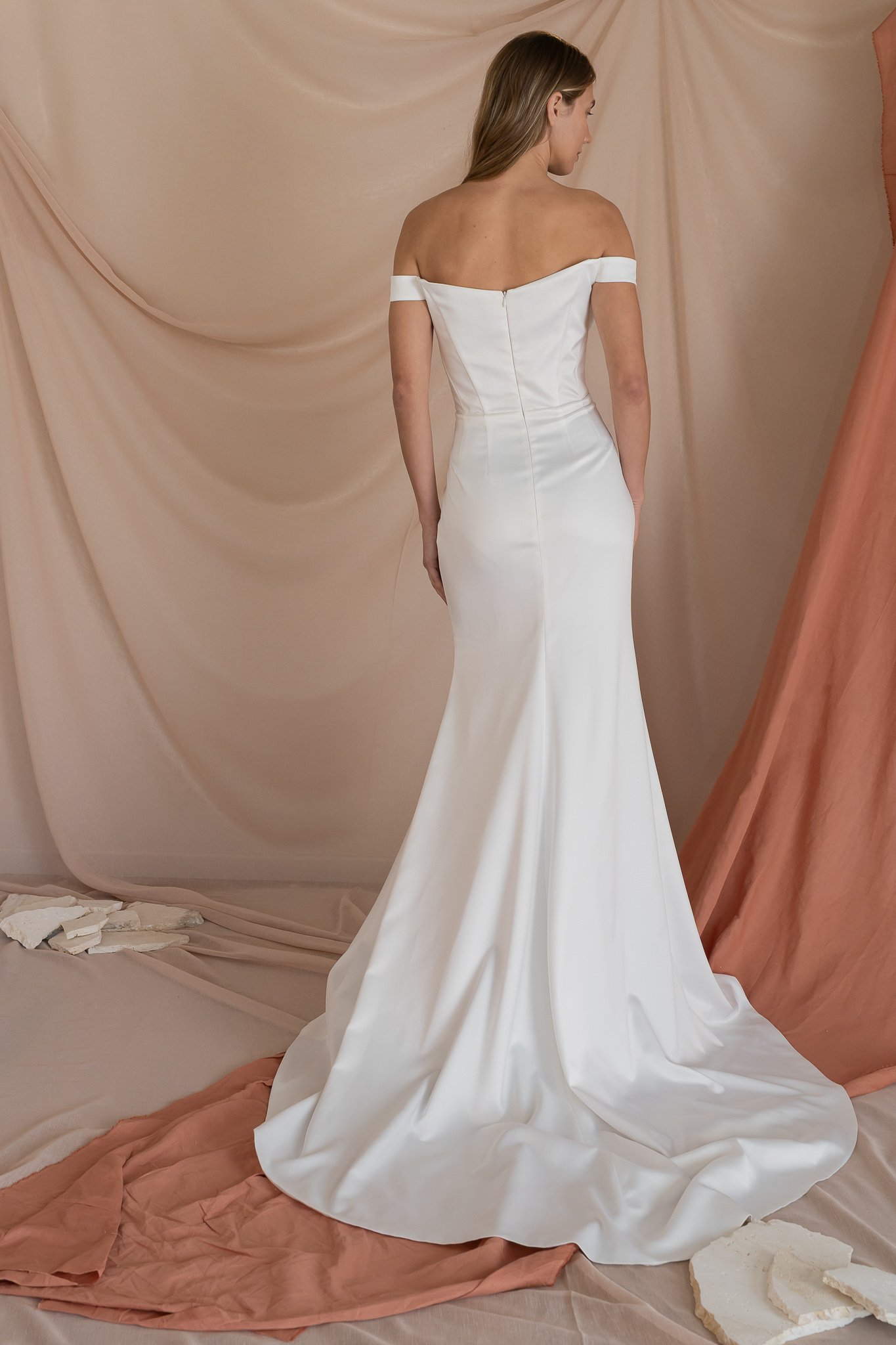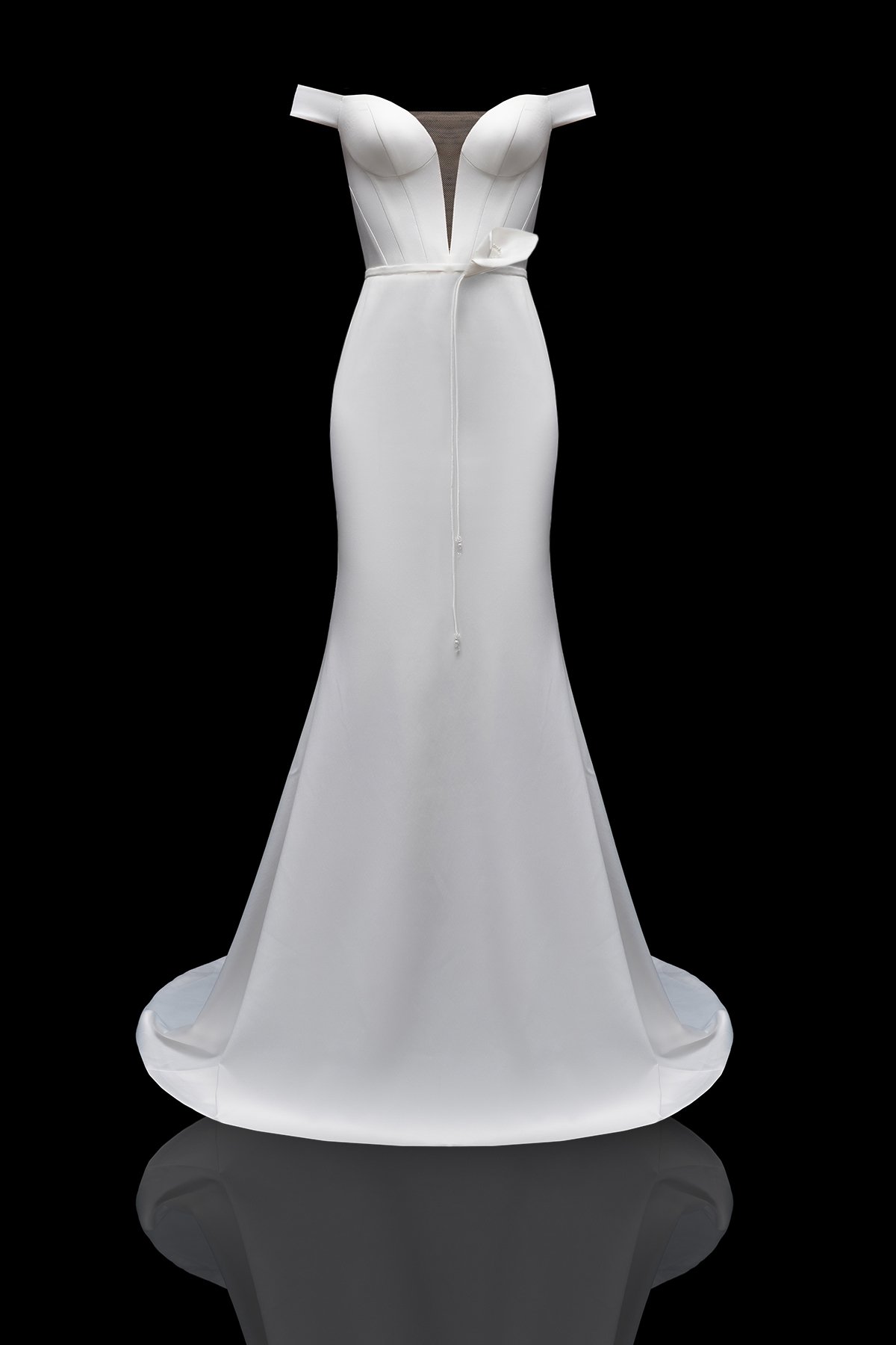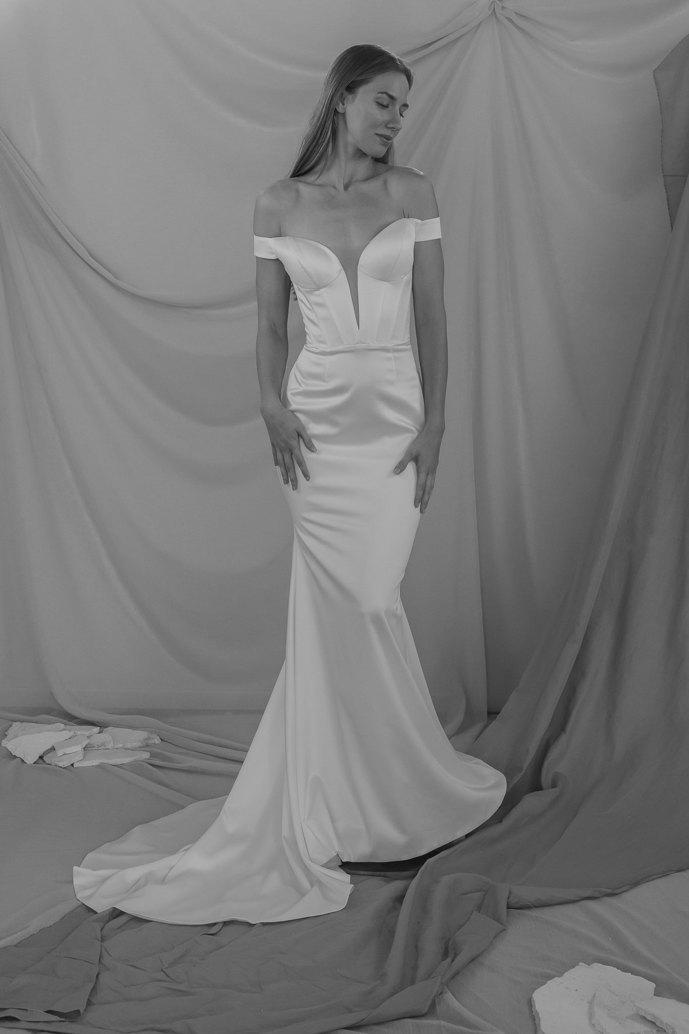 Radiate bridal charm in our ivory fitted off the shoulder wedding gown. This dress boasts a captivating fitted bodice, with a stunning v neck drop and off the shoulder sleeves. The fitted skirt accentuates your figure, making it the perfect choice for your special day. With a touch of opulence and modern allure, this dress will ensure you shine as the center of attention as you say “I do” in style.
