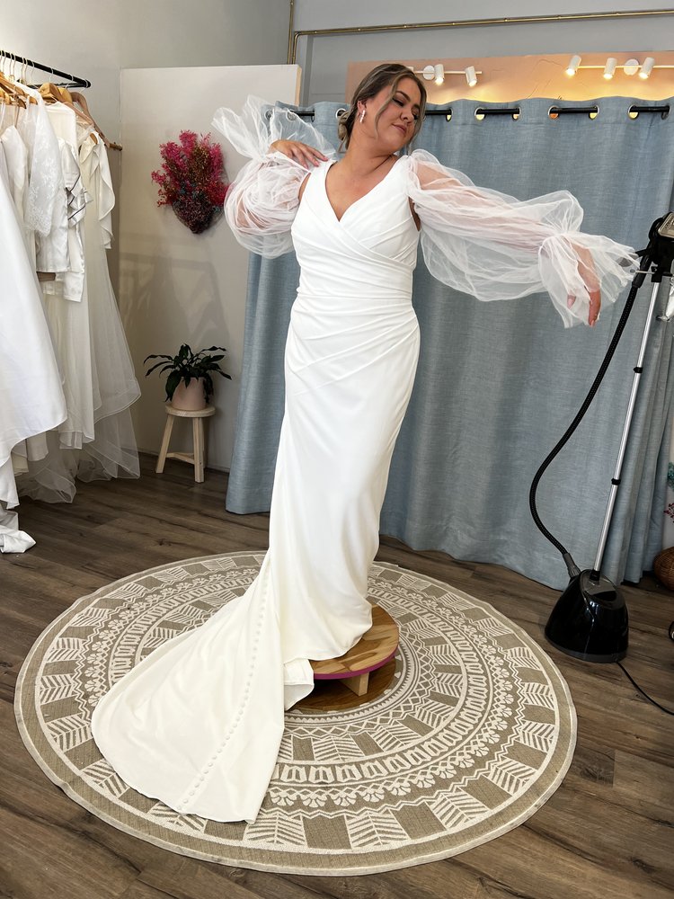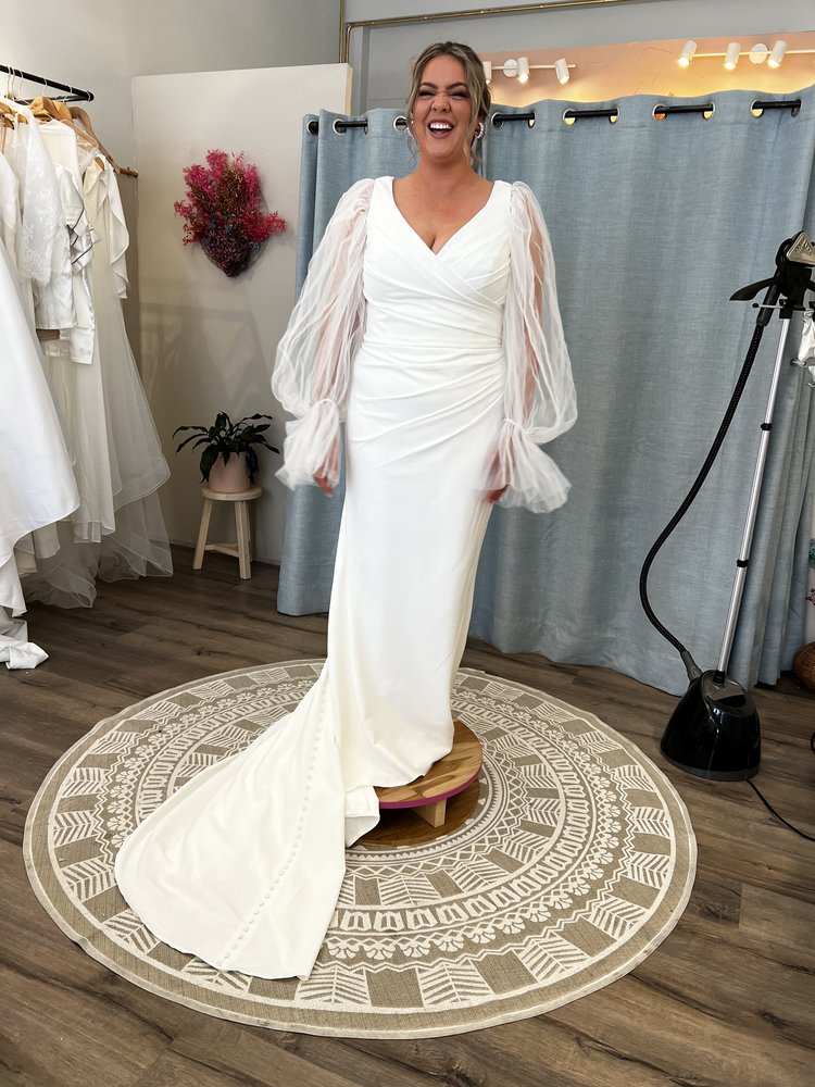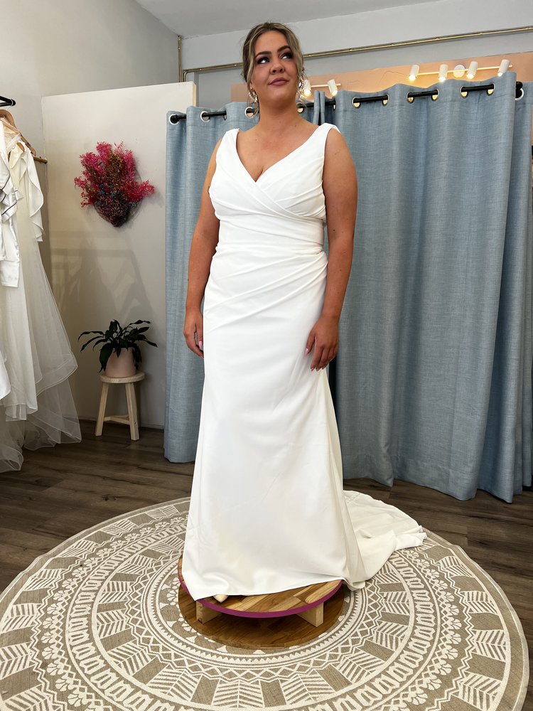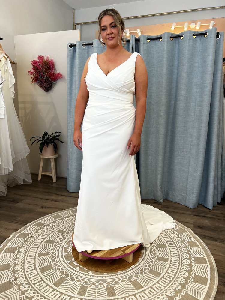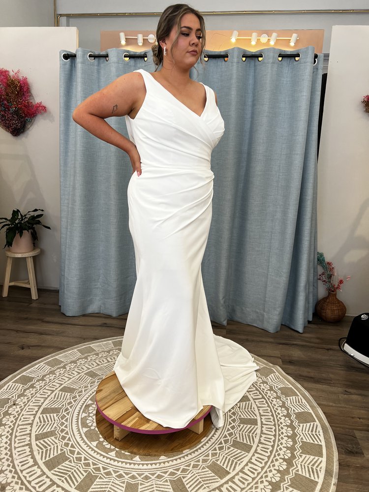 This v-neck, cowl back, fitted gown is stunning and so so flattering, with cups built in and boning to make it fit well it shows off all the curves and makes for a sexy yet elegant look. Perfect to pair with sleeves for the ultimate cool bride look.